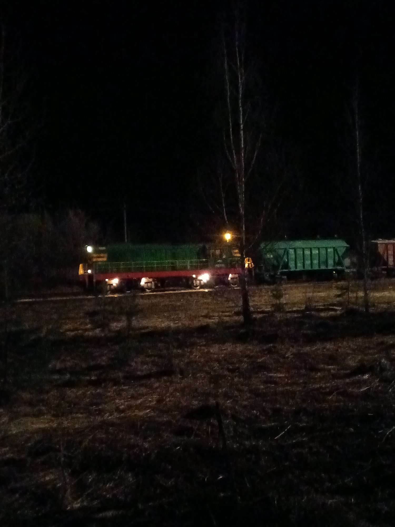 The image captures a nighttime scene in Andreyevo, Russia, featuring a train on tracks amidst a dark, outdoor environment. The time of day is clearly night, with the scene illuminated primarily by art…read more