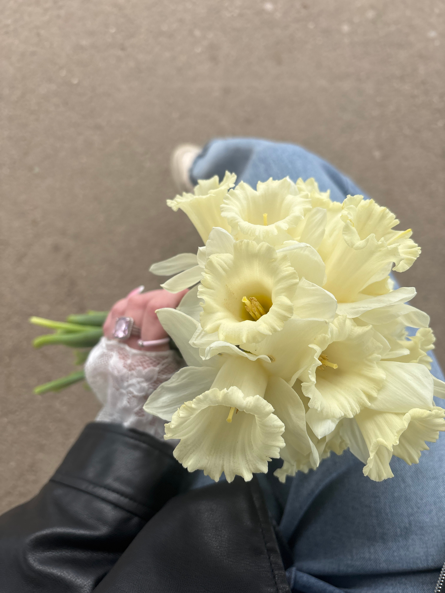 A person is holding a bouquet of white daffodils. The person is wearing blue jeans, a black leather jacket, and a white lace sleeve. The location is outside, possibly a street, as evidenced by the con…read more