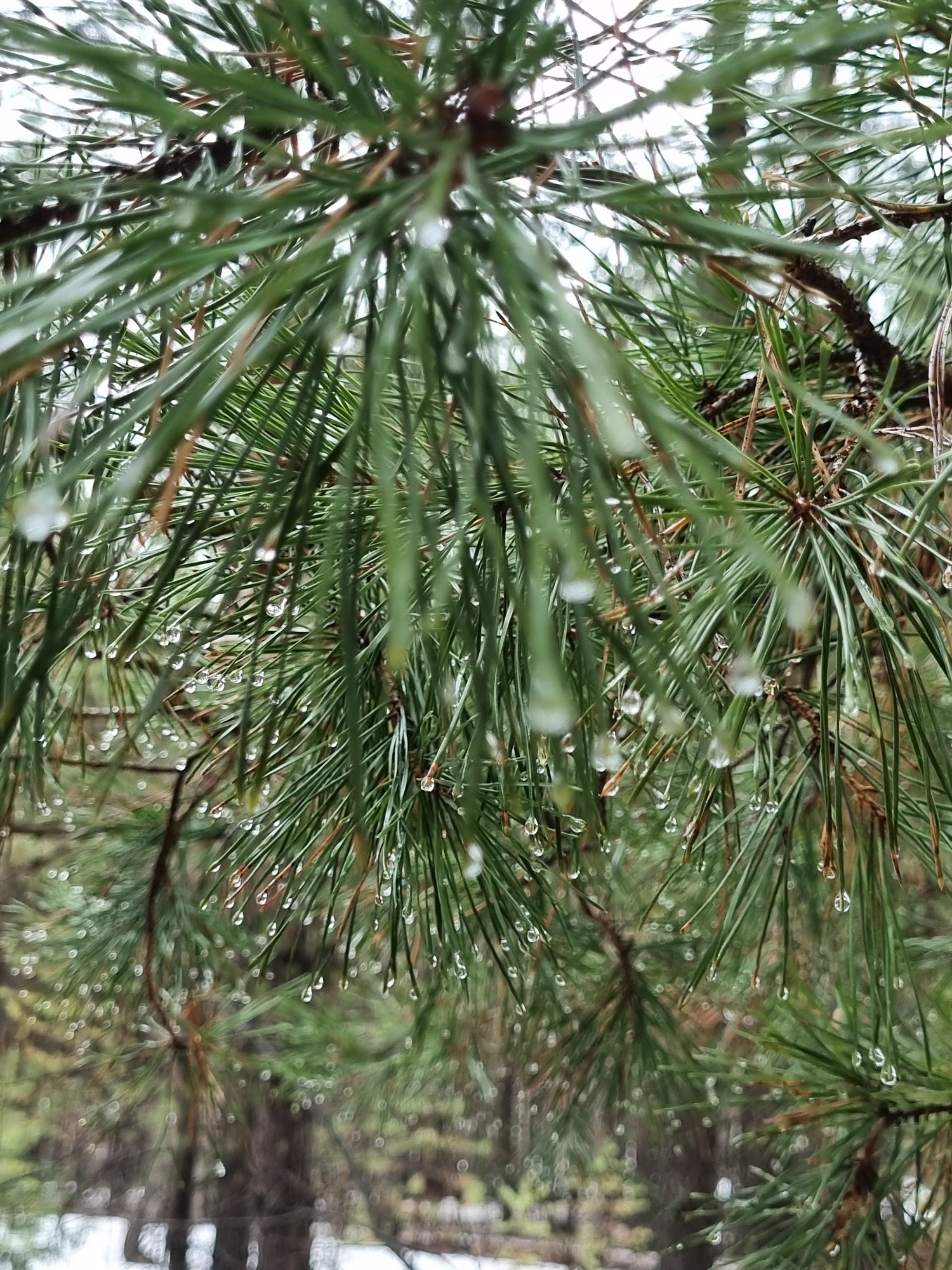 The image depicts a close-up view of pine needles covered in water droplets. The needles are green and appear to be from a coniferous tree. The background is blurred, suggesting a wooded area. Based o…read more