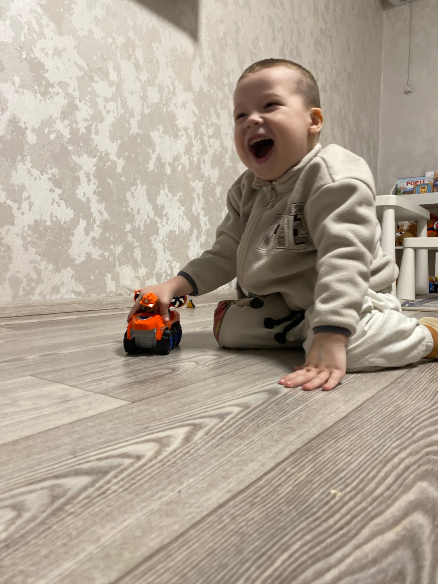 A young child with short, light brown hair, wearing a light gray tracksuit, is lying on a light-colored wooden floor. The child is holding an orange and black toy truck with their left hand and reachiβ¦read more