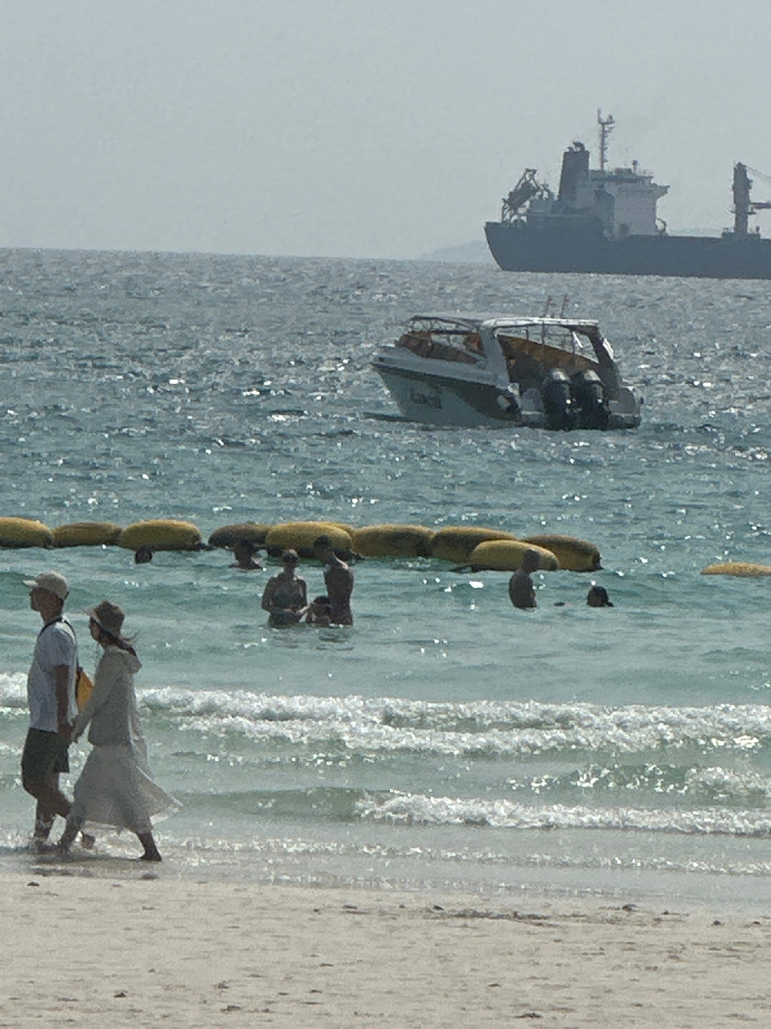 A horizontal eye-level shot depicts a beach scene, likely in Pattaya City, Thailand. A tan sand beach is on the right. A couple is seen walking on the beach toward the viewer. A person in a dress and…read more