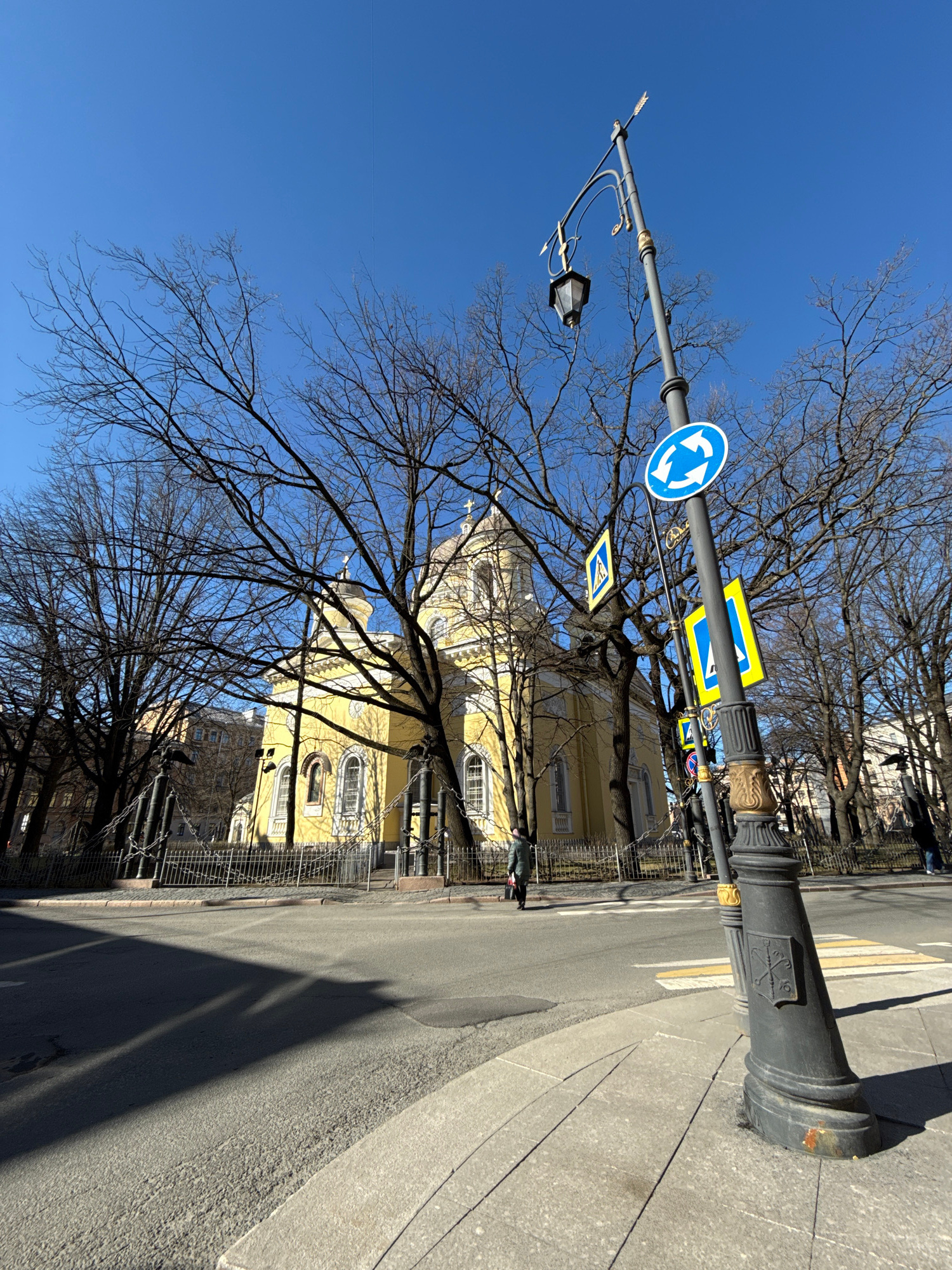 The image shows a street scene in Saint Petersburg, Russia, taken on a sunny day with a clear blue sky. A lamppost with a roundabout traffic sign is in the foreground on the left, along with other tra…read more