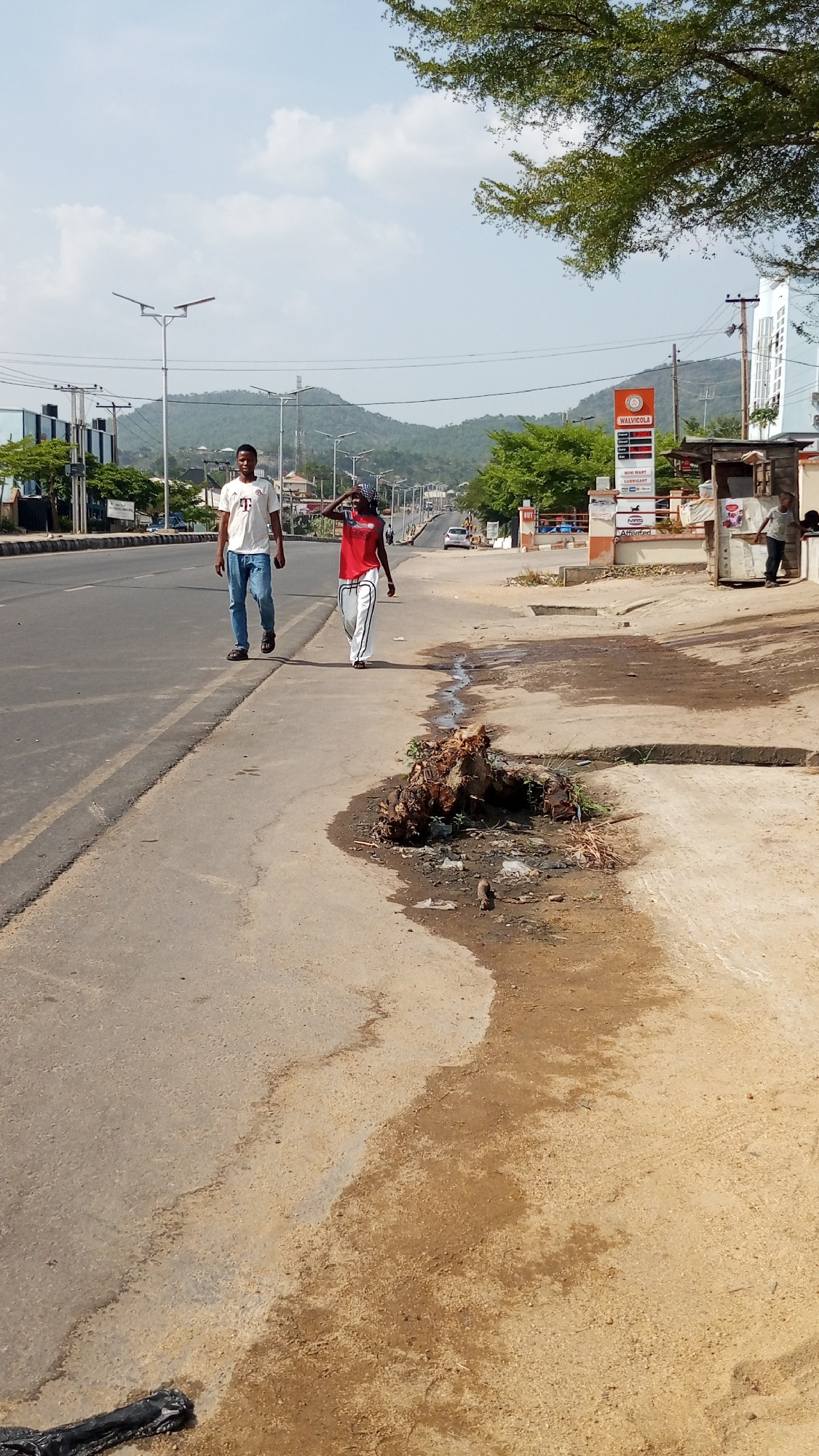 The scene is a street in Adankolo, Nigeria, showing two people walking alongside a road with a Walvicola gas station in the background. One person is wearing a white t-shirt and blue jeans, and the ot…read more