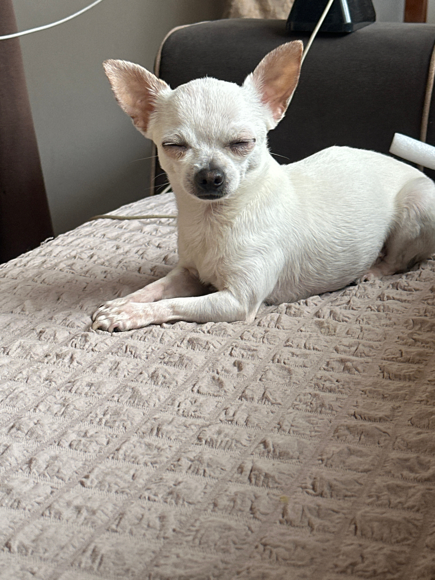 A white chihuahua is sleeping on a textured, light-colored surface, possibly a couch or dog bed. The dog is mostly lying on its side, with its head tilted slightly upward. Its eyes are closed, and its…read more