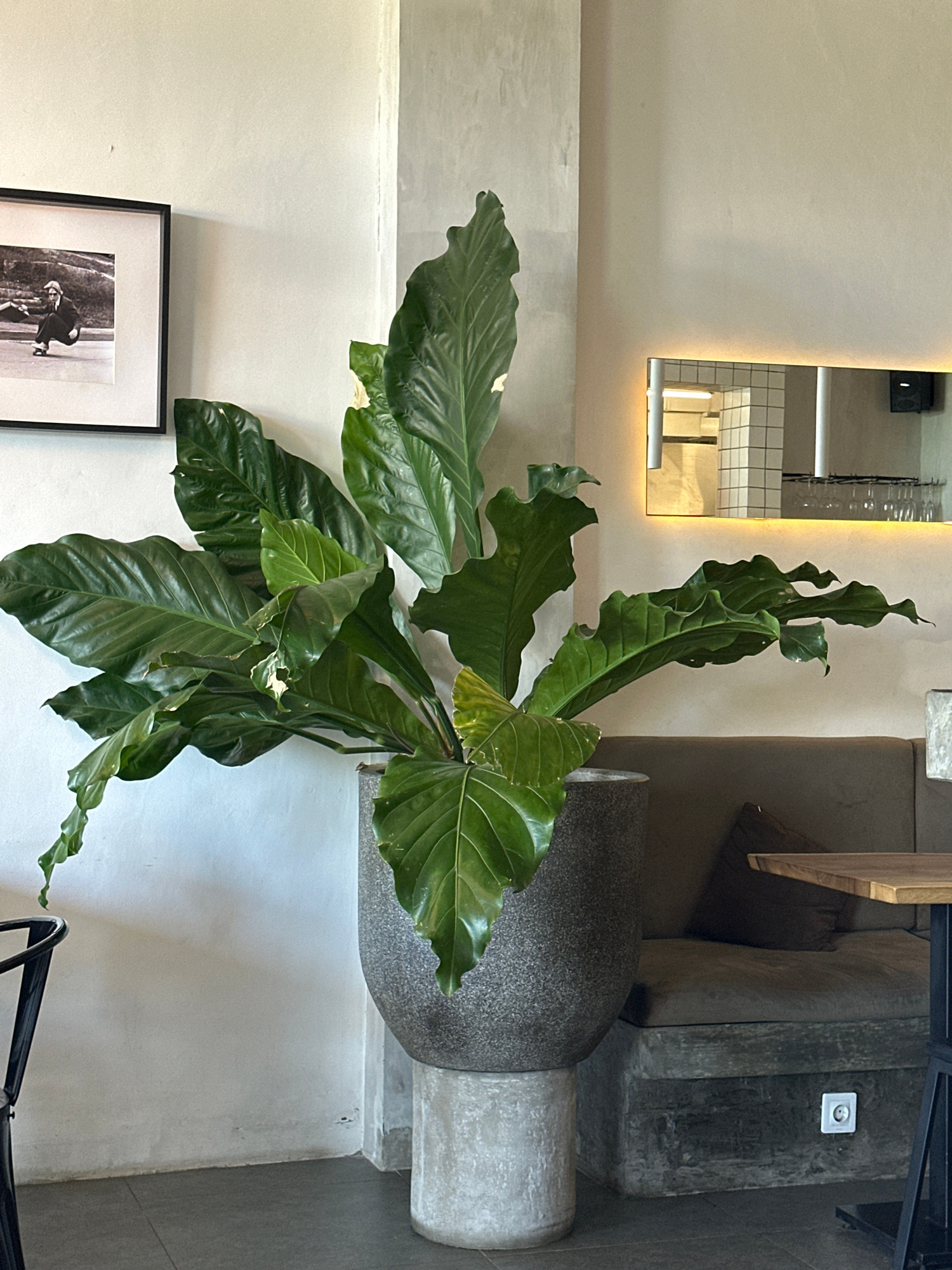 A large green plant in a gray pot dominates the scene. The plant has large, glossy leaves. A black-framed picture hangs on the wall below the plant. The environment appears to be an indoor space withβ¦read more