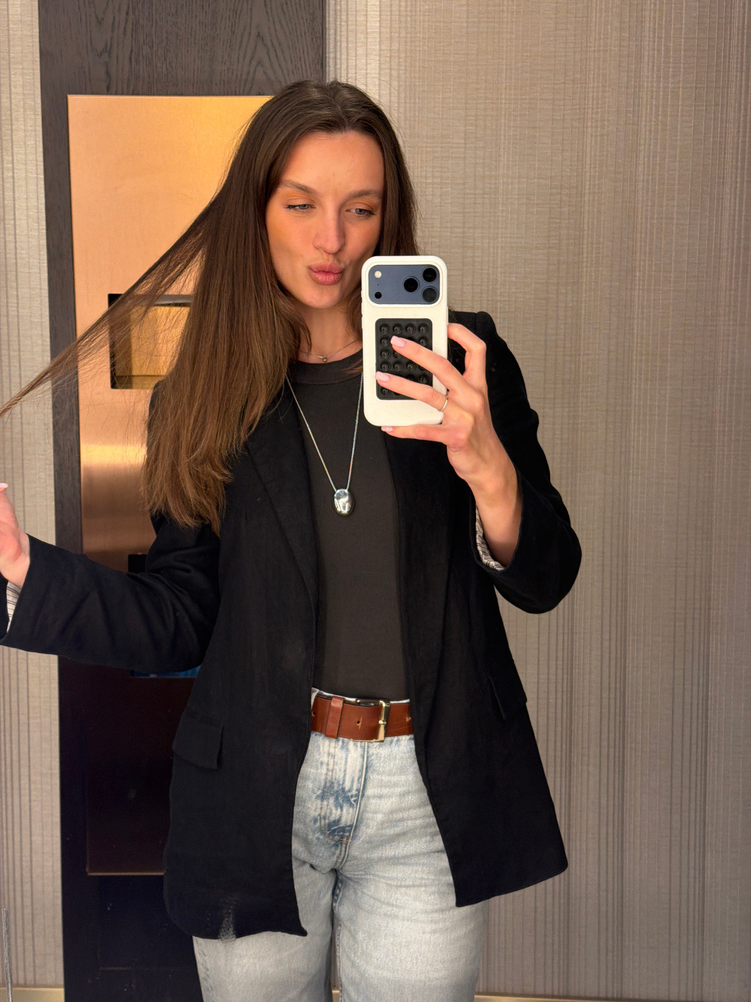 A woman is taking a selfie in a room with horizontally striped walls. She is wearing light wash jeans with a brown belt, a black t-shirt, and a black blazer. She is holding a white smartphone with a c…read more