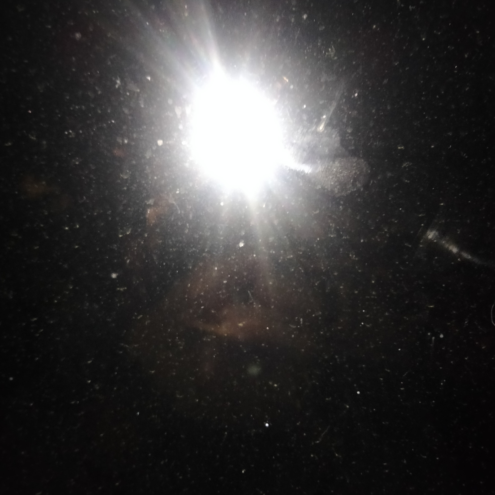 The image is a dark, low-quality photograph with a bright light source in the center, possibly a reflection of the sun or a light fixture. The surrounding area is mostly black, with visible dust or pa…read more