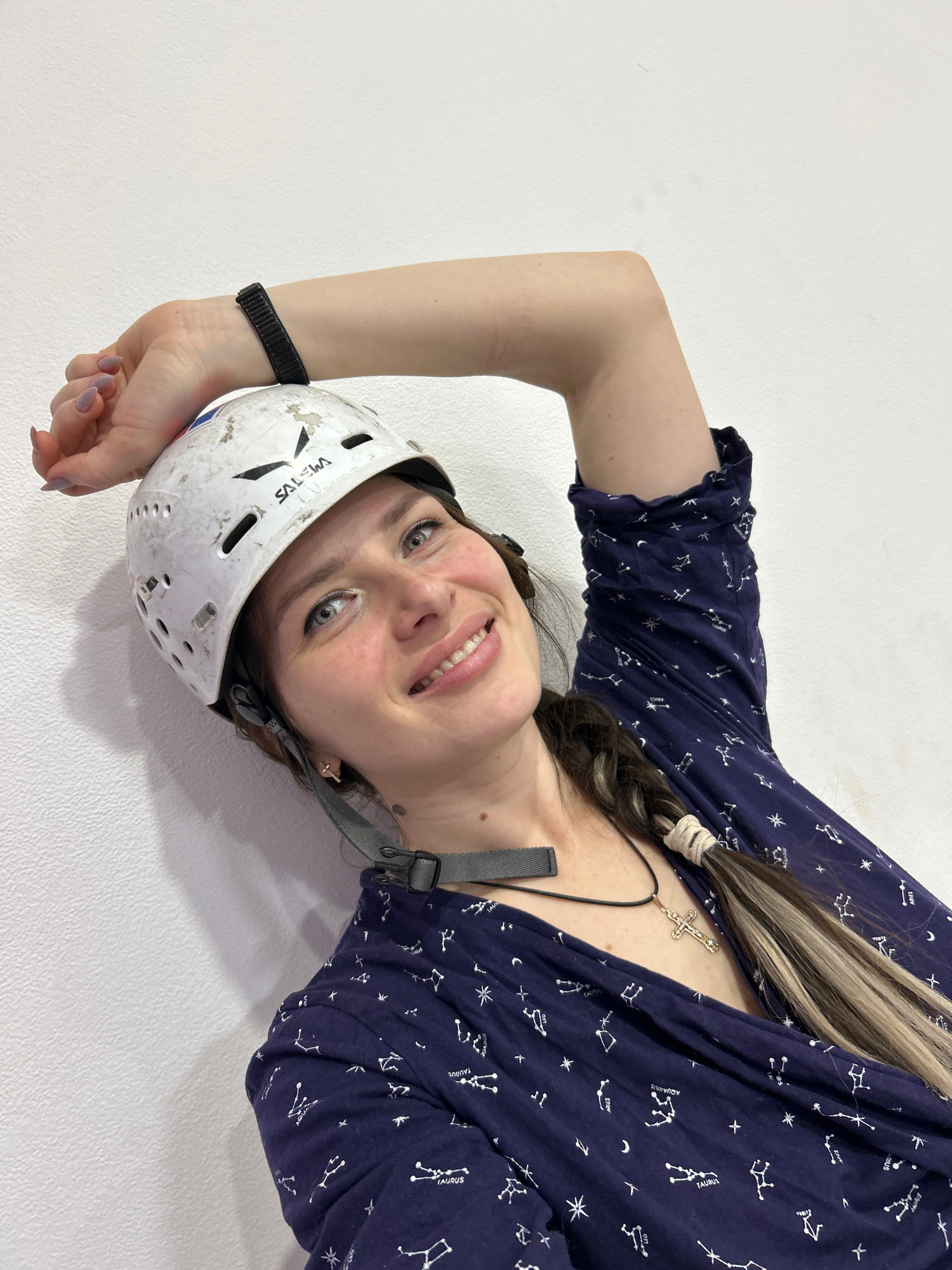 A young woman is shown in a portrait-style image, rotated 90 degrees counter-clockwise, smiling directly at the viewer. She has green/blue eyes and dark hair with a prominent light-blonde streak, whic…read more