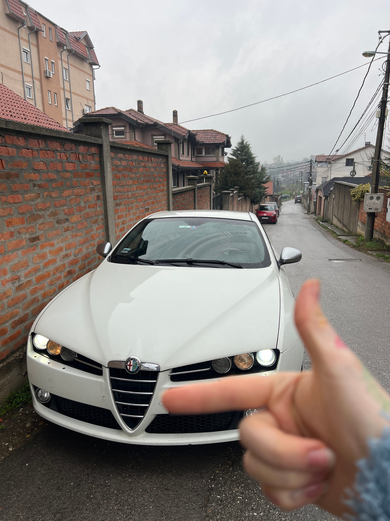 A white Alfa Romeo Brera is parked on a narrow street in Palilula Urban Municipality, Serbia. The car faces up the street. A person's hand and finger point towards the vehicle. The street is lined wit…read more