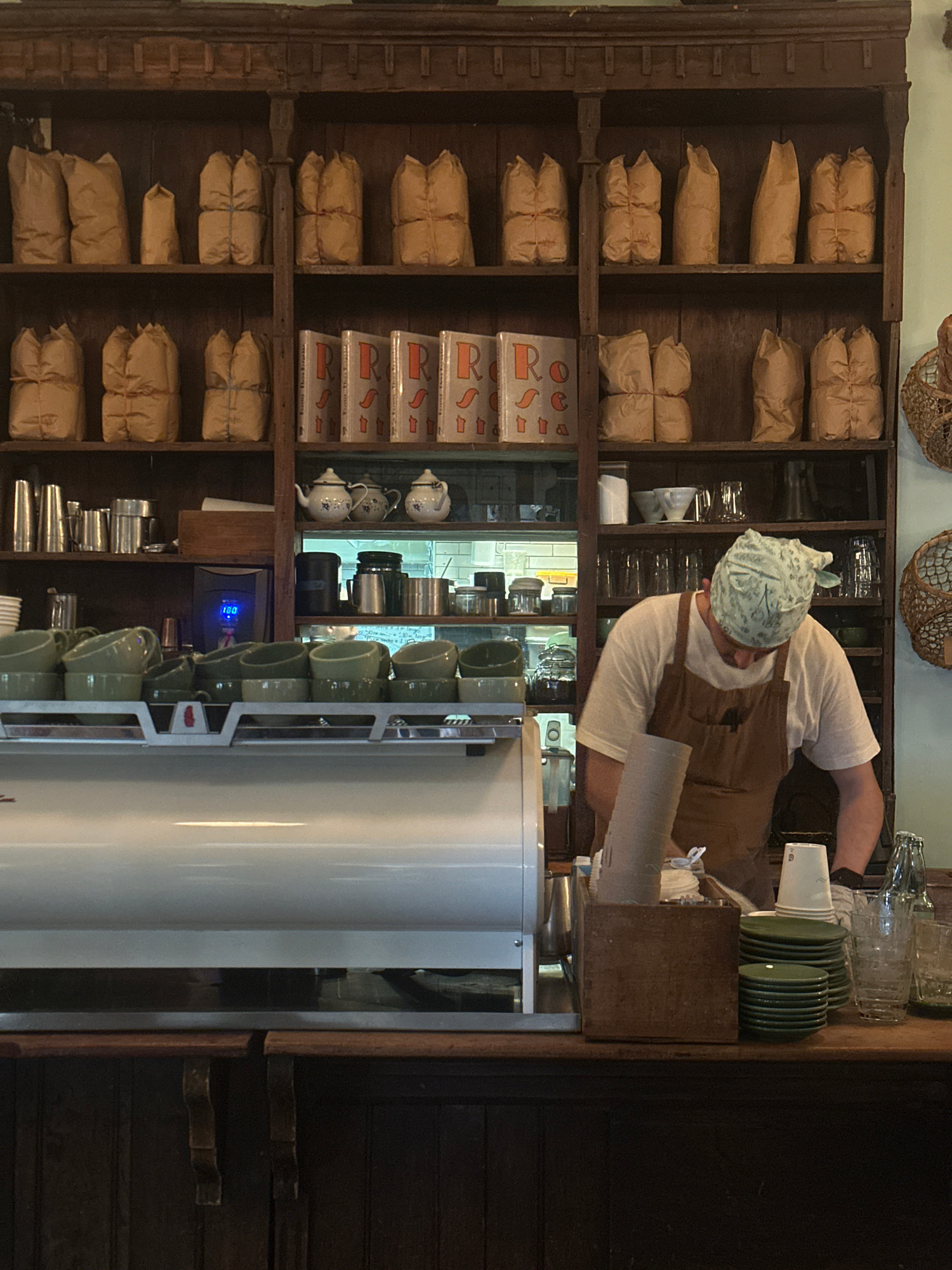 The image depicts the interior of a shop, likely a coffee shop, in Mexico City, Mexico. A worker wearing a head covering and an apron is positioned behind a counter. The background features a wooden s…read more
