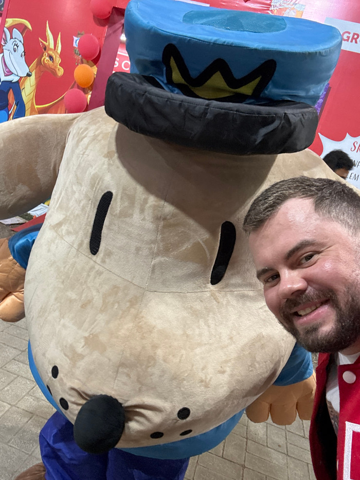 This image depicts an indoor or covered event scene in Bidhannagar, India. In the foreground, an adult male, visible from the chest up on the right side of the frame, is taking a selfie. He has short…read more