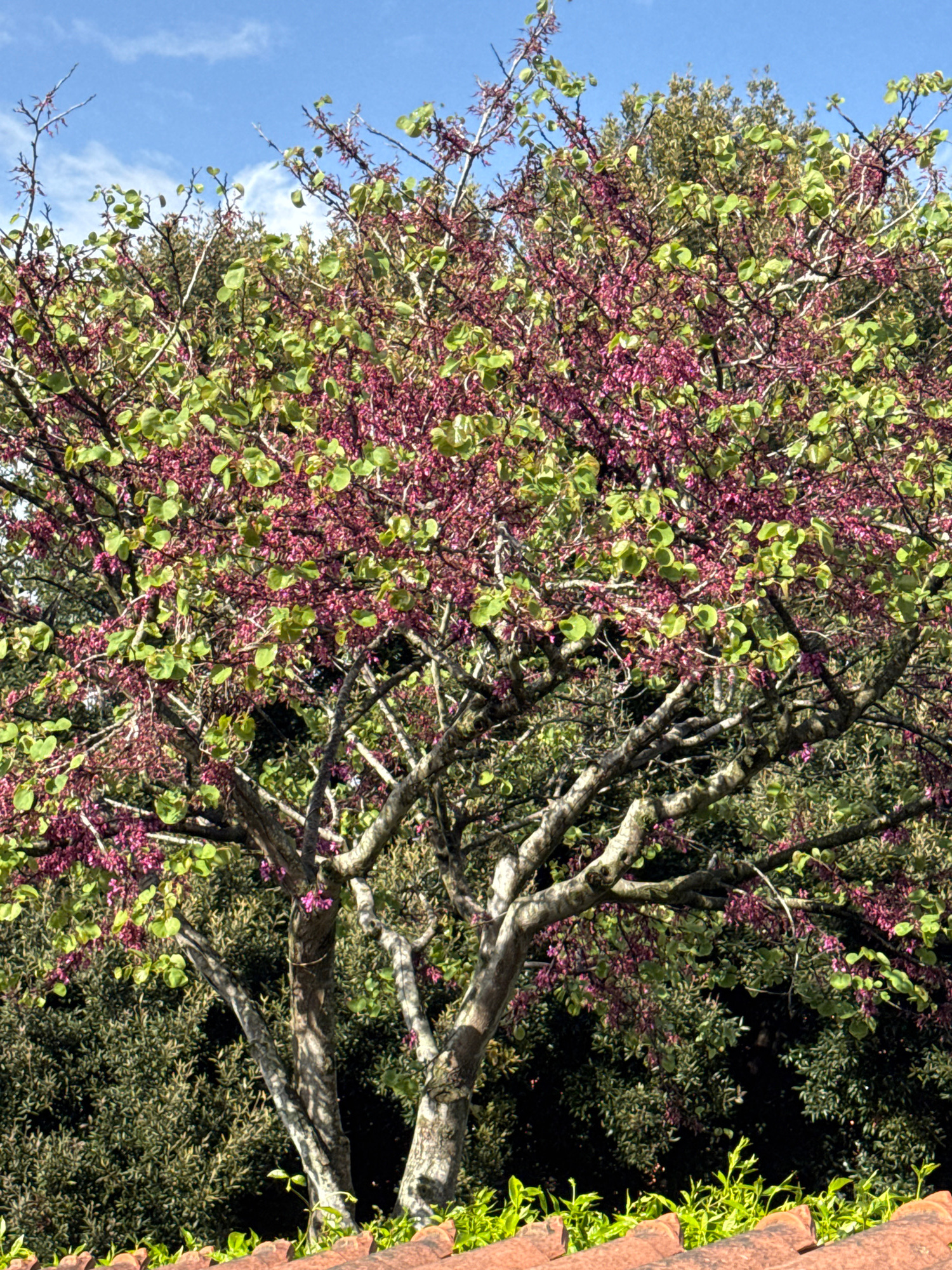 An eye-level, medium-shot captures a flowering tree with purple blossoms and green leaves. The tree's branches are light gray. The left portion of the frame includes a blue sky with wisps of white clo…read more