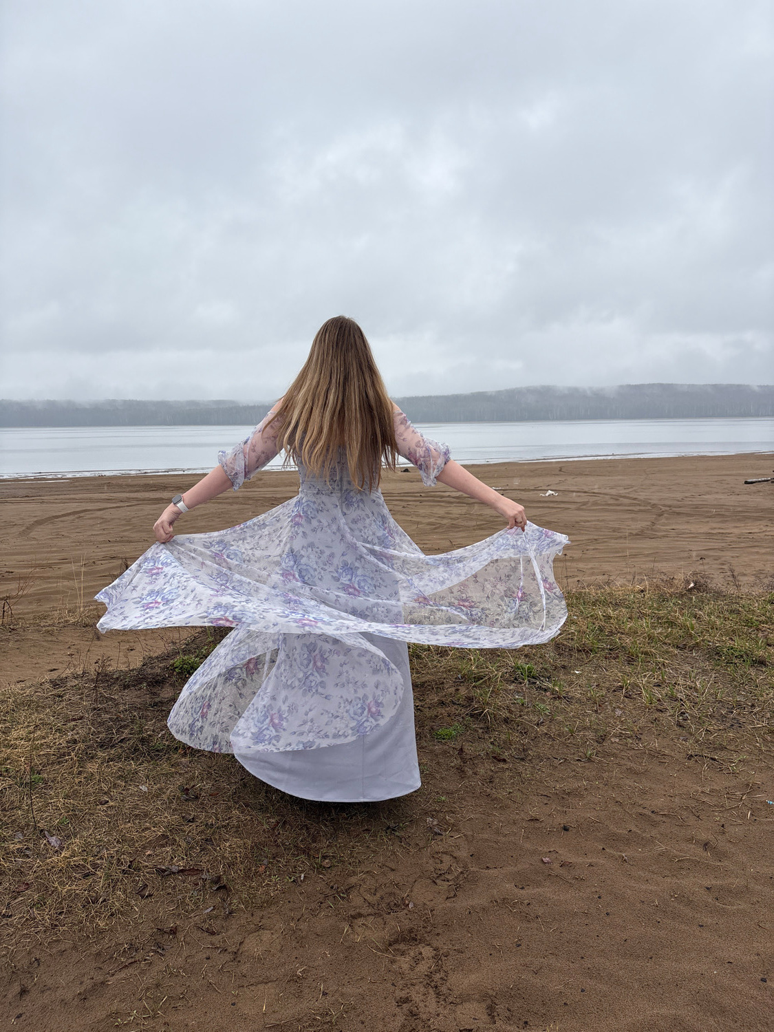 The image displays an outdoor scene of a person on a sandy or muddy shoreline next to a wide body of water, possibly a lake or a large river. The sky is uniformly overcast and gray, indicating a cloud…read more