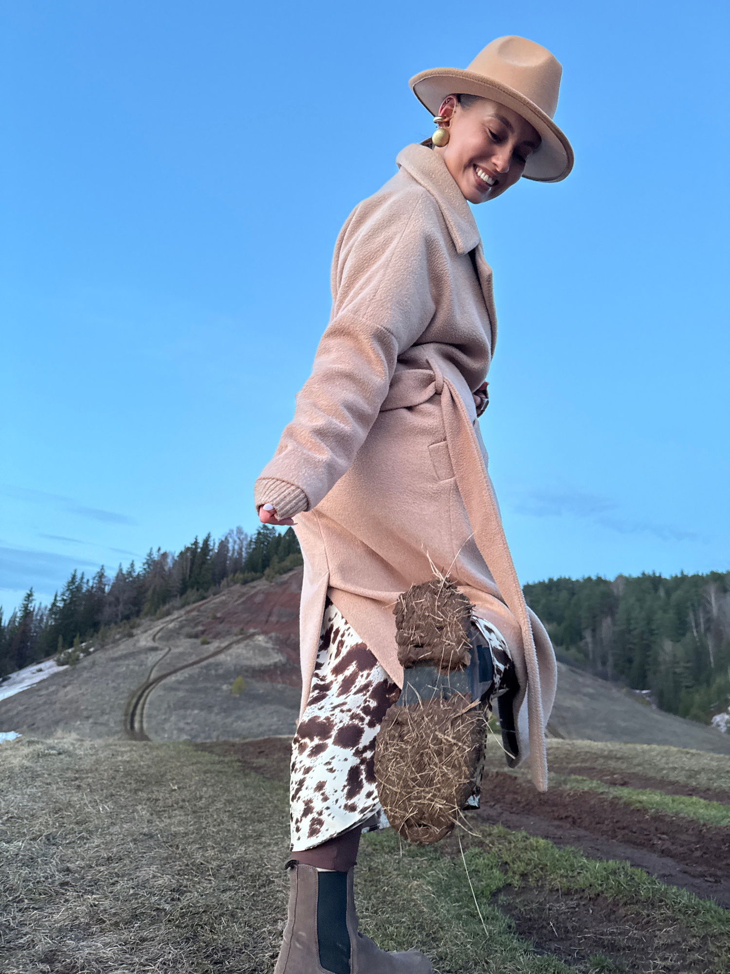 A woman is posing for a photograph in an outdoor, rural setting in Ольховка, Russia. She is wearing a tan fedora, a tan coat, a cow-print dress, and brown boots. She is smiling. The background consist…read more