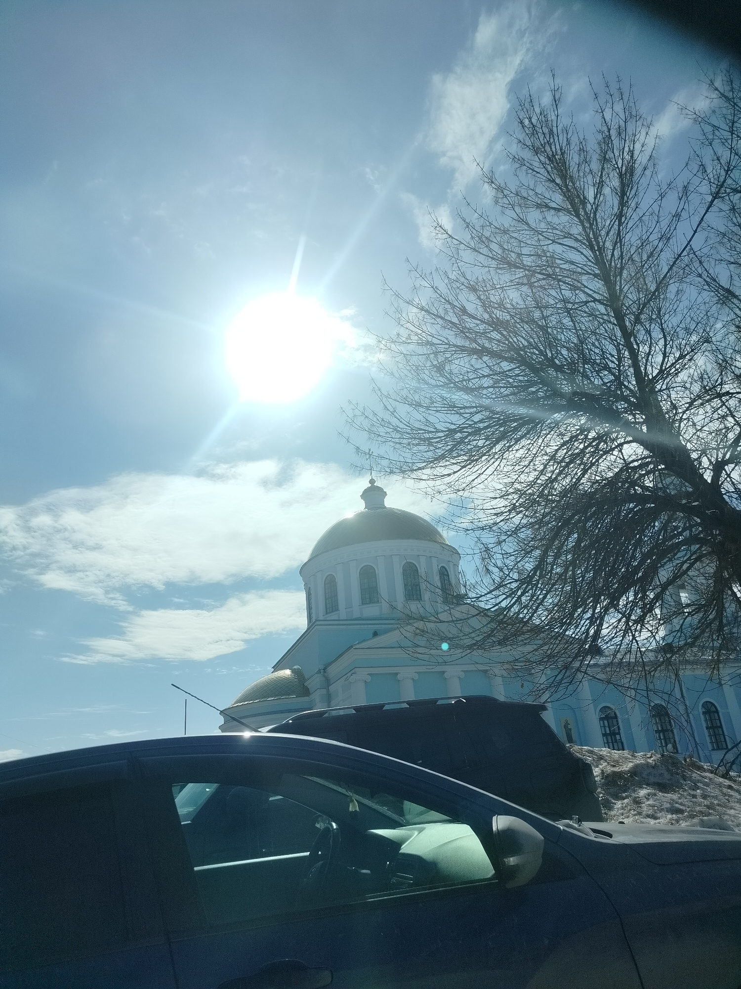 The image depicts a scene featuring the Annunciation Cathedral (Благовещенский собор) in Votkinsk, Udmurtia, Russia, located at Ulitsa Kikvidze, 2. The cathedral's light blue facade, characterized by…read more
