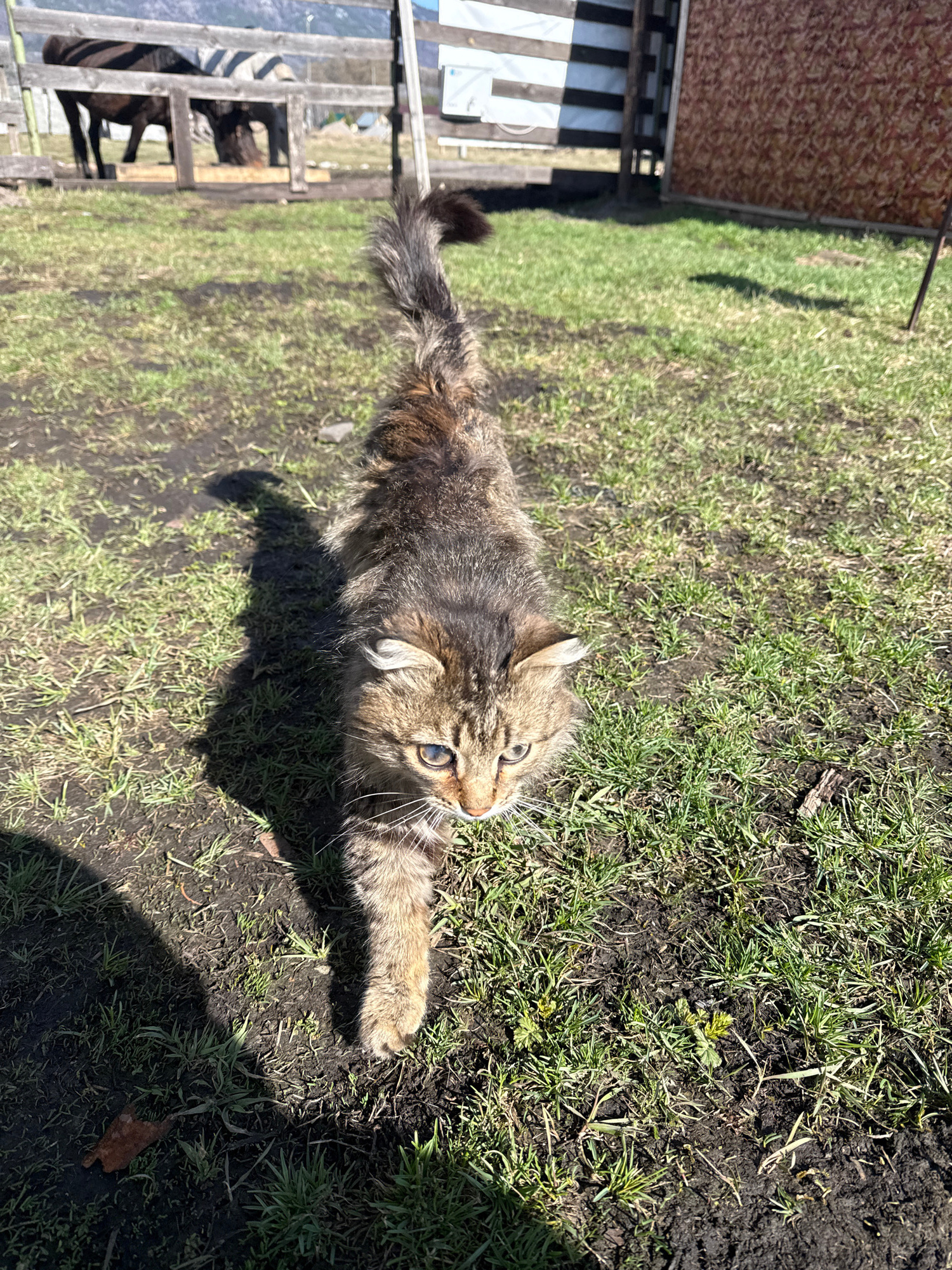 The image captures a fluffy, long-haired tabby cat stretching across a brightly lit, tilted outdoor scene. The cat's fur features a mix of brown, grey, and black stripes, and its striking blue-green eā¦read more