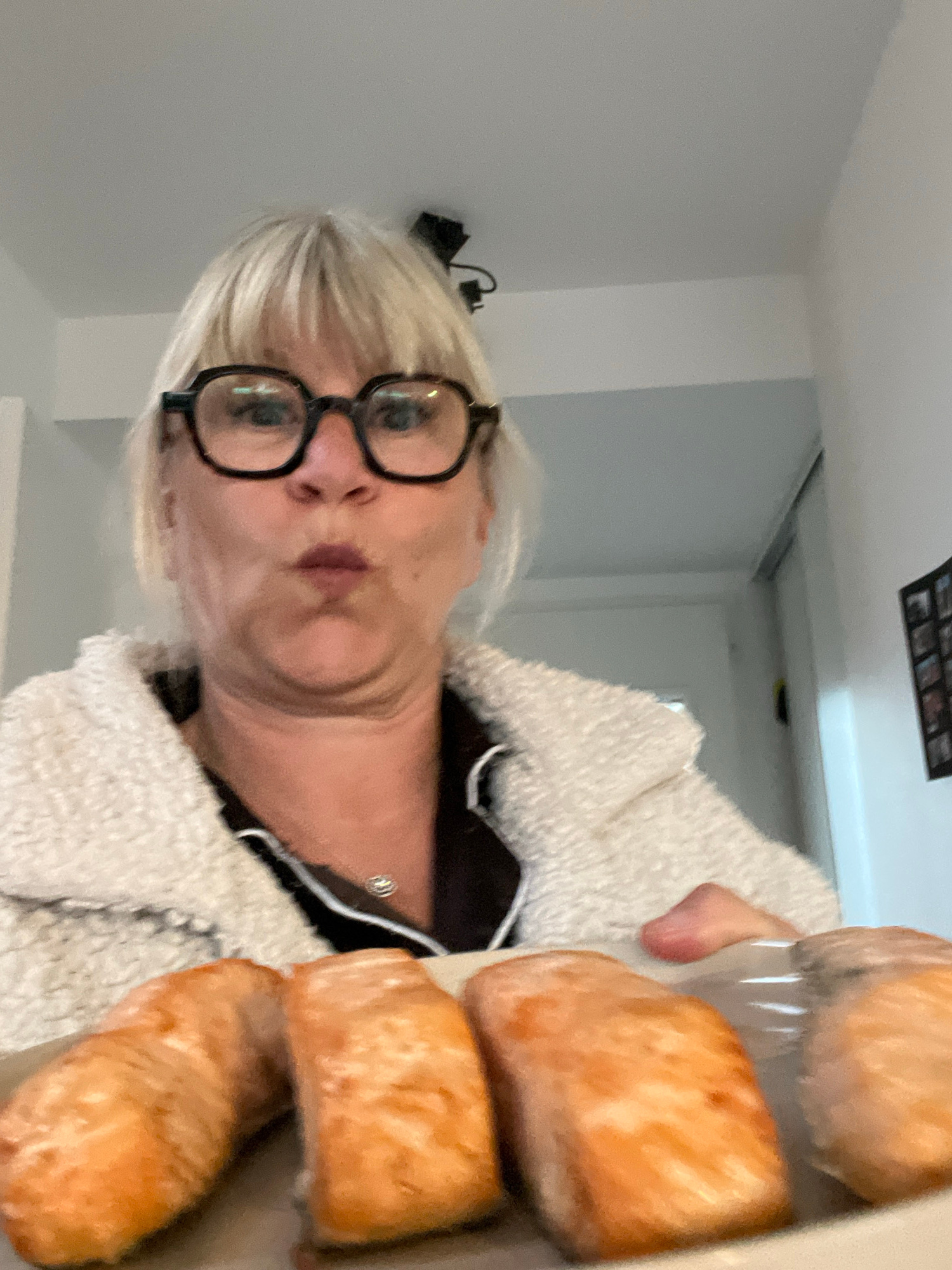 The image shows a woman wearing glasses and a light-colored, textured jacket. She is holding a container with several small, bread-like rolls inside. The background appears to be an interior space, po…read more