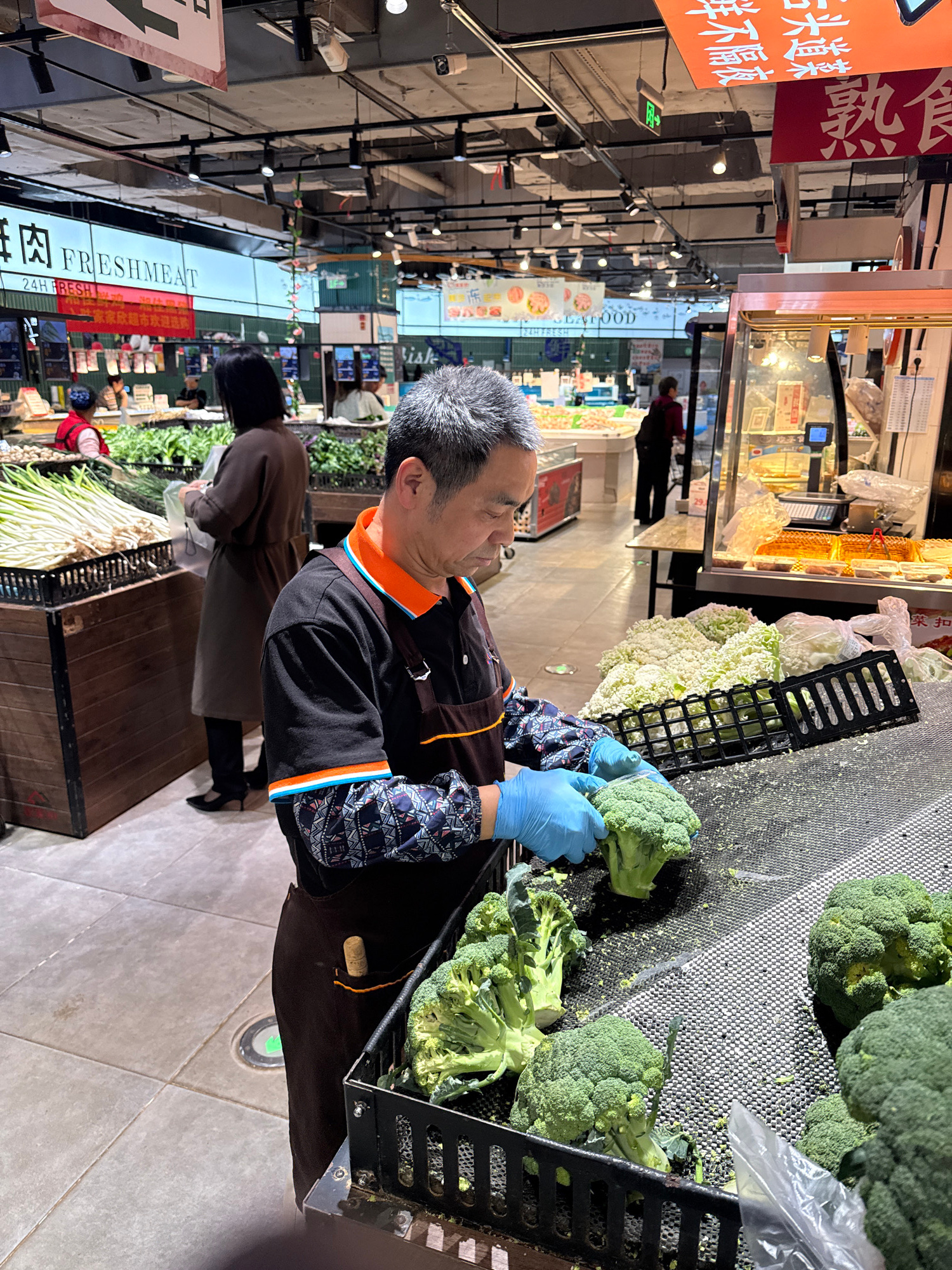 An image taken in Jiangjin, China, shows a man in a supermarket wearing blue gloves sorting broccoli. He's wearing a black shirt with an orange-trimmed collar and patterned sleeves. He is placing broc…read more
