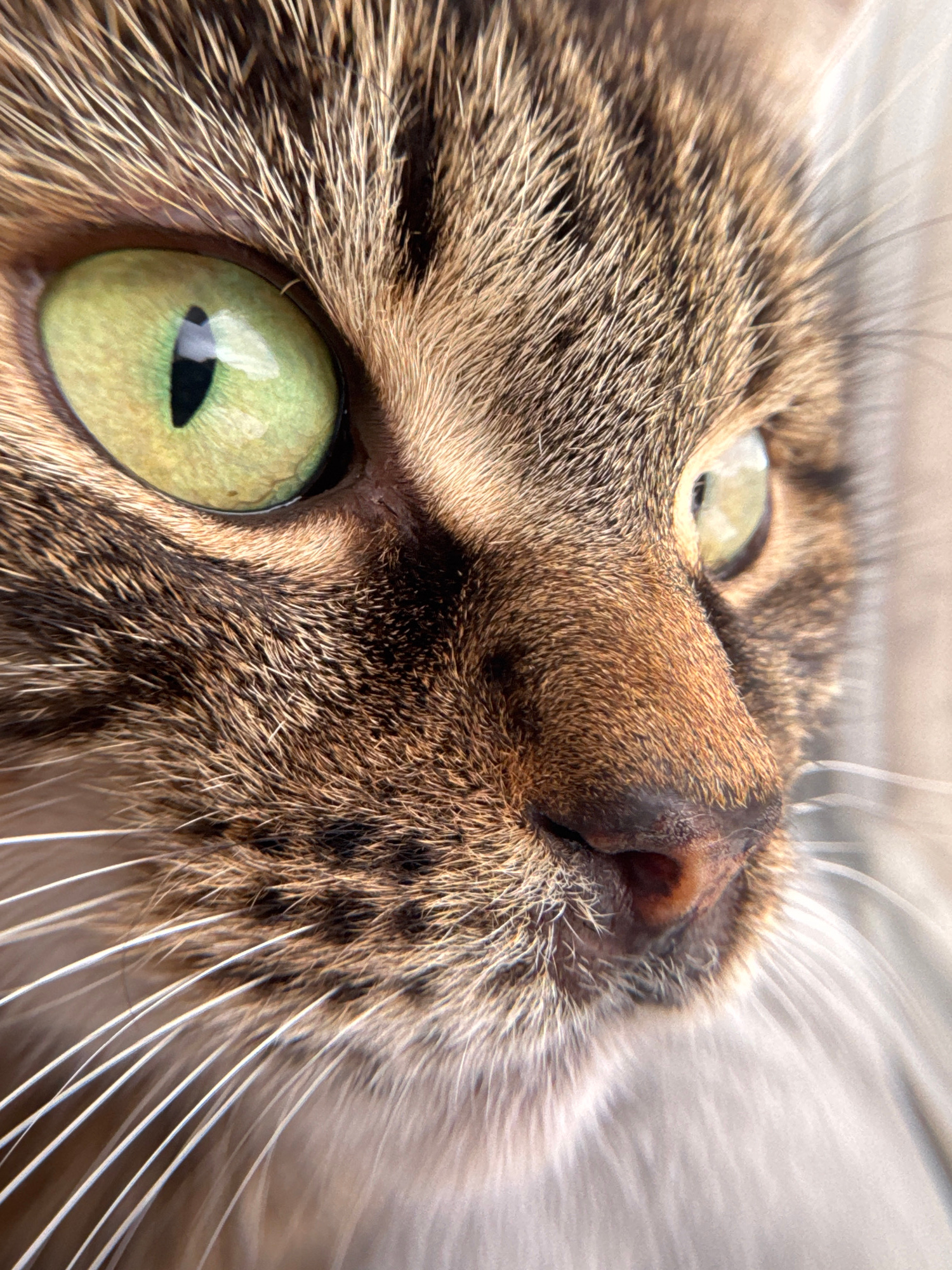 A close-up, extreme angle view of a brown tabby cat. The cat's face is angled upward, with its nose prominent in the center of the frame. The cat has green eyes with vertical pupils. The fur is detailβ¦read more