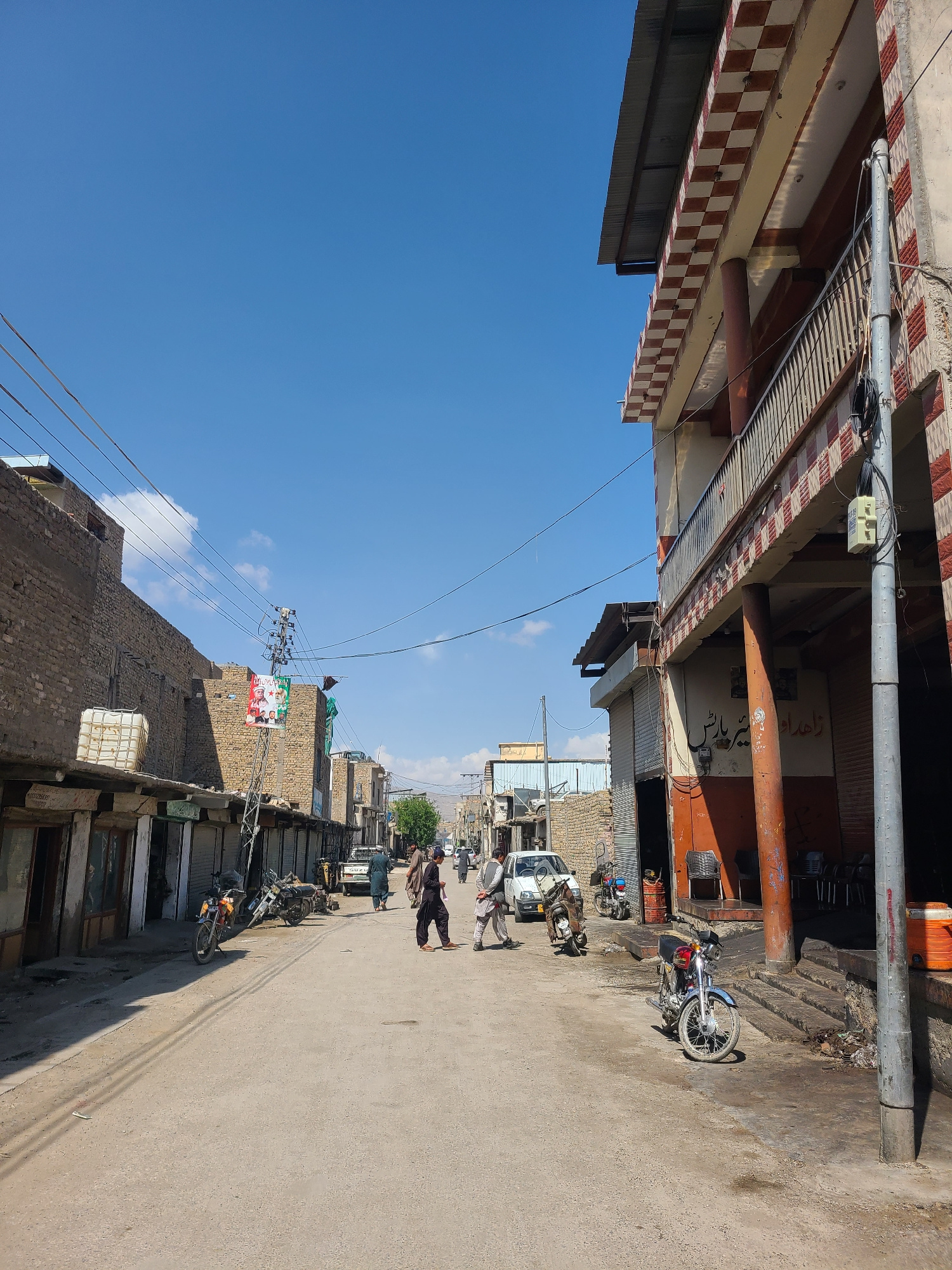 This photo shows a street in Quetta City Tehsil, Pakistan. The street is lined with buildings of varying heights and architectural styles, some with awnings or overhanging structures. Motorbikes are p…read more