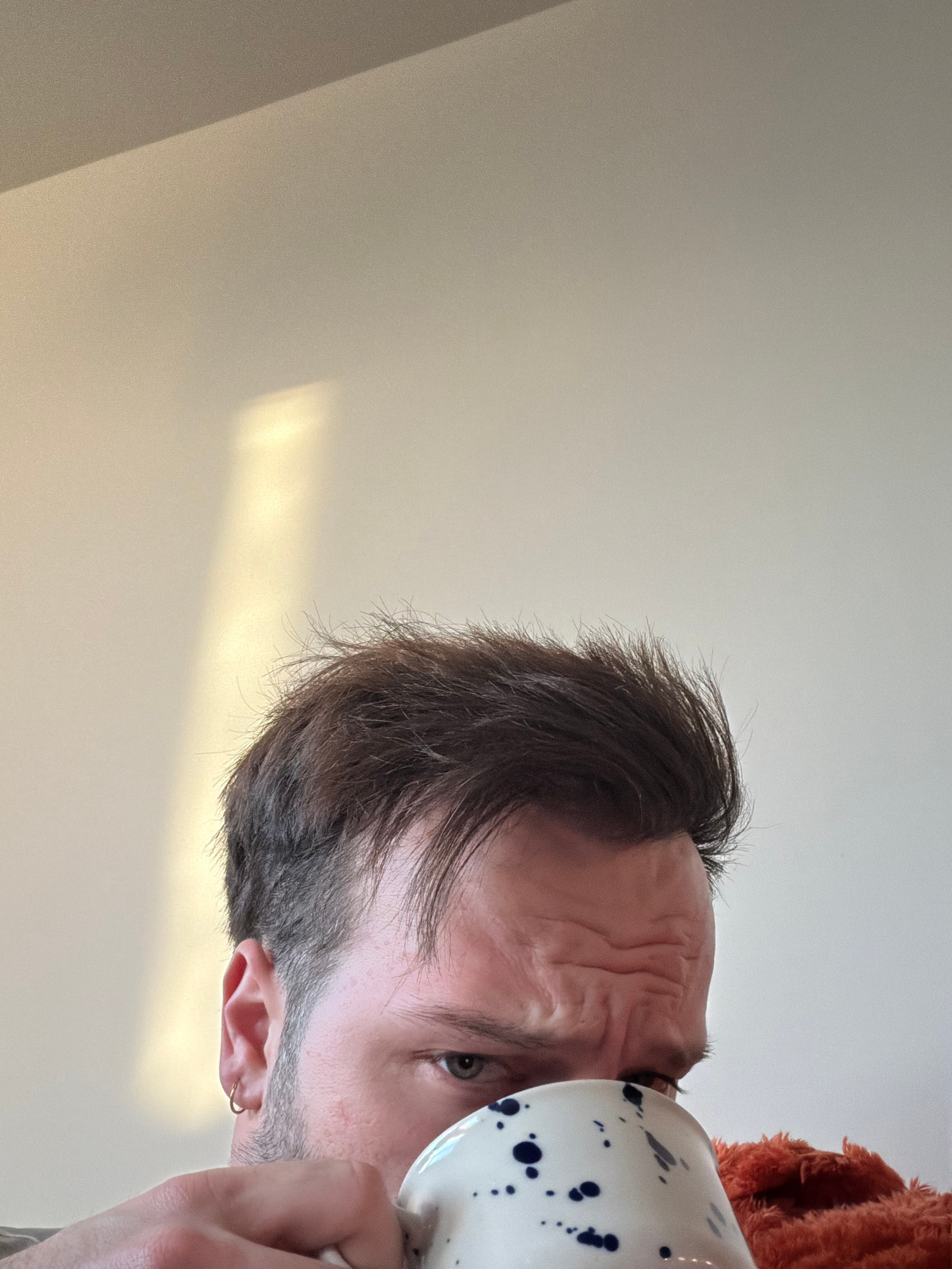 The image, originally oriented horizontally, captures a close-up, worm's-eye view of a person (presumably male) drinking from a mug in an indoor setting in Laval, Canada. The individual's head is tilt…read more