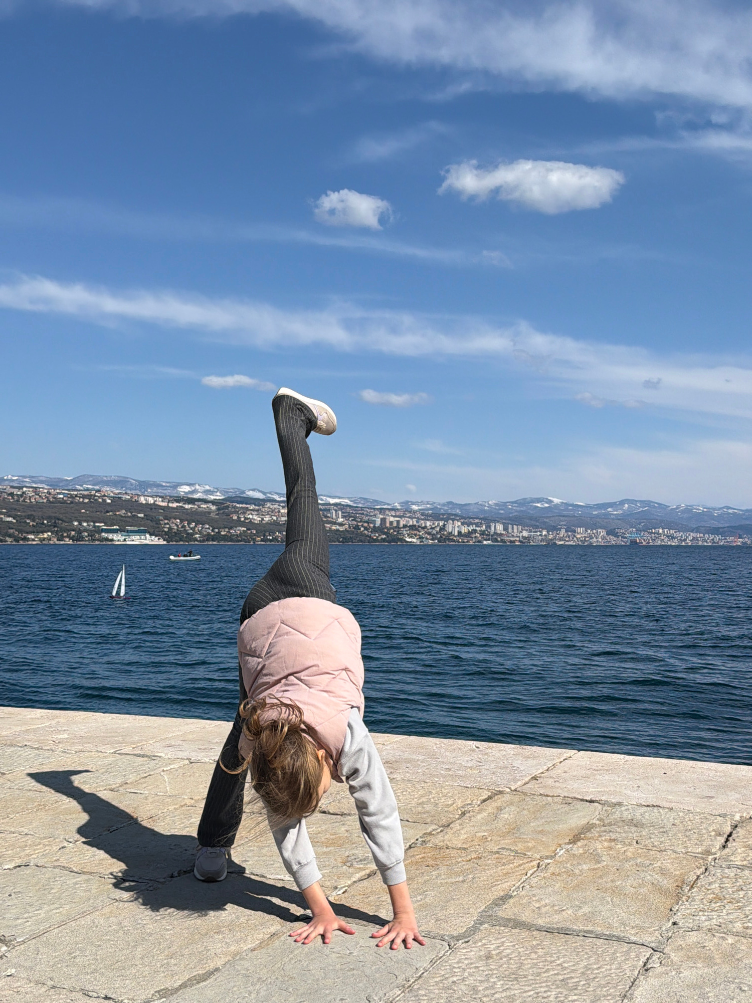 A young individual is performing an inverted pose on a stone pier in Grad Opatija, Croatia, under bright daylight conditions. The person, identifiable as a child or adolescent with light brown hair ti…read more