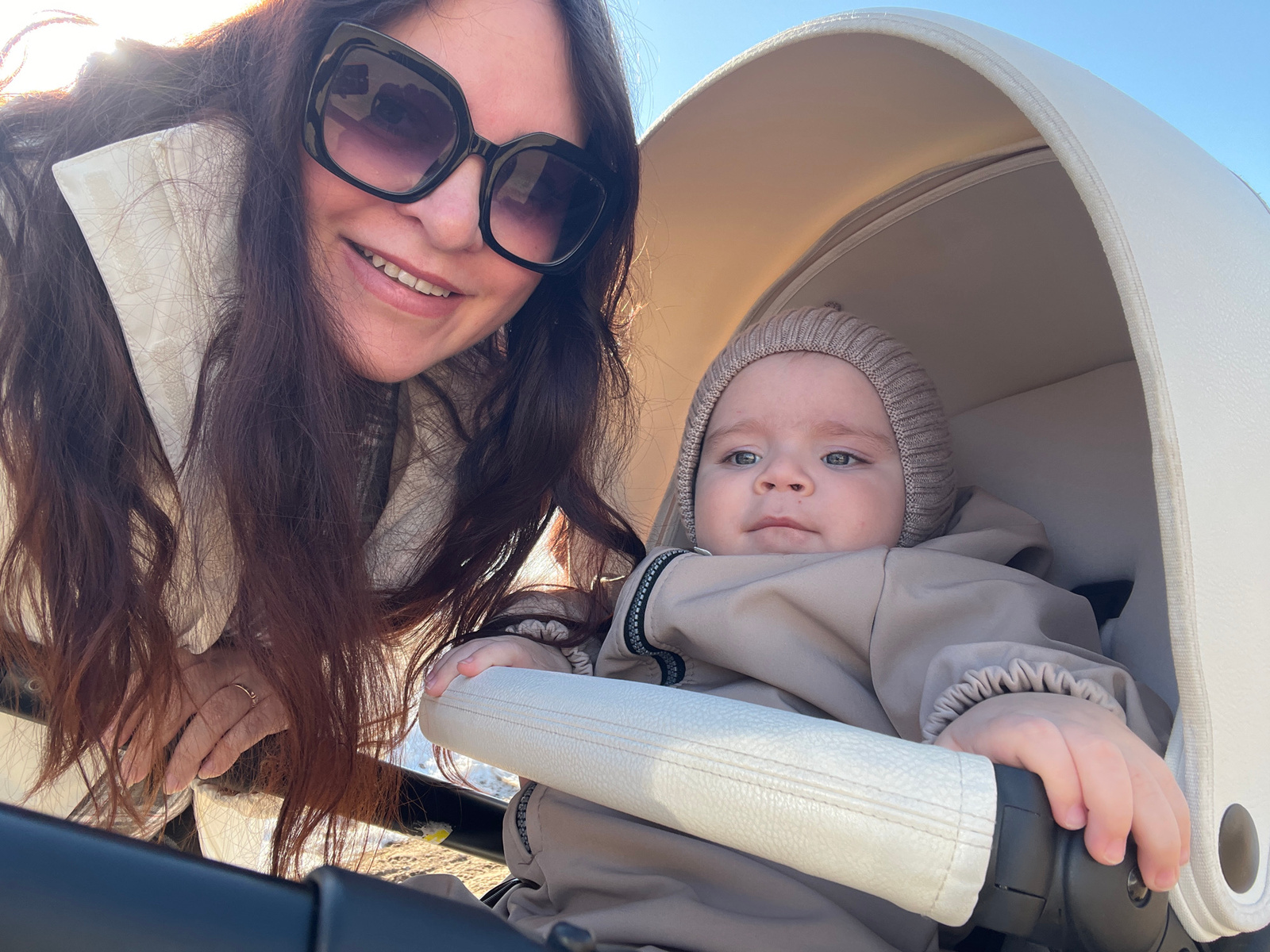 A low-angle, selfie-style photograph shows a woman and a young child, both positioned upside down from the perspective of the viewer. The woman has dark hair and is wearing sunglasses. She is smiling,…read more