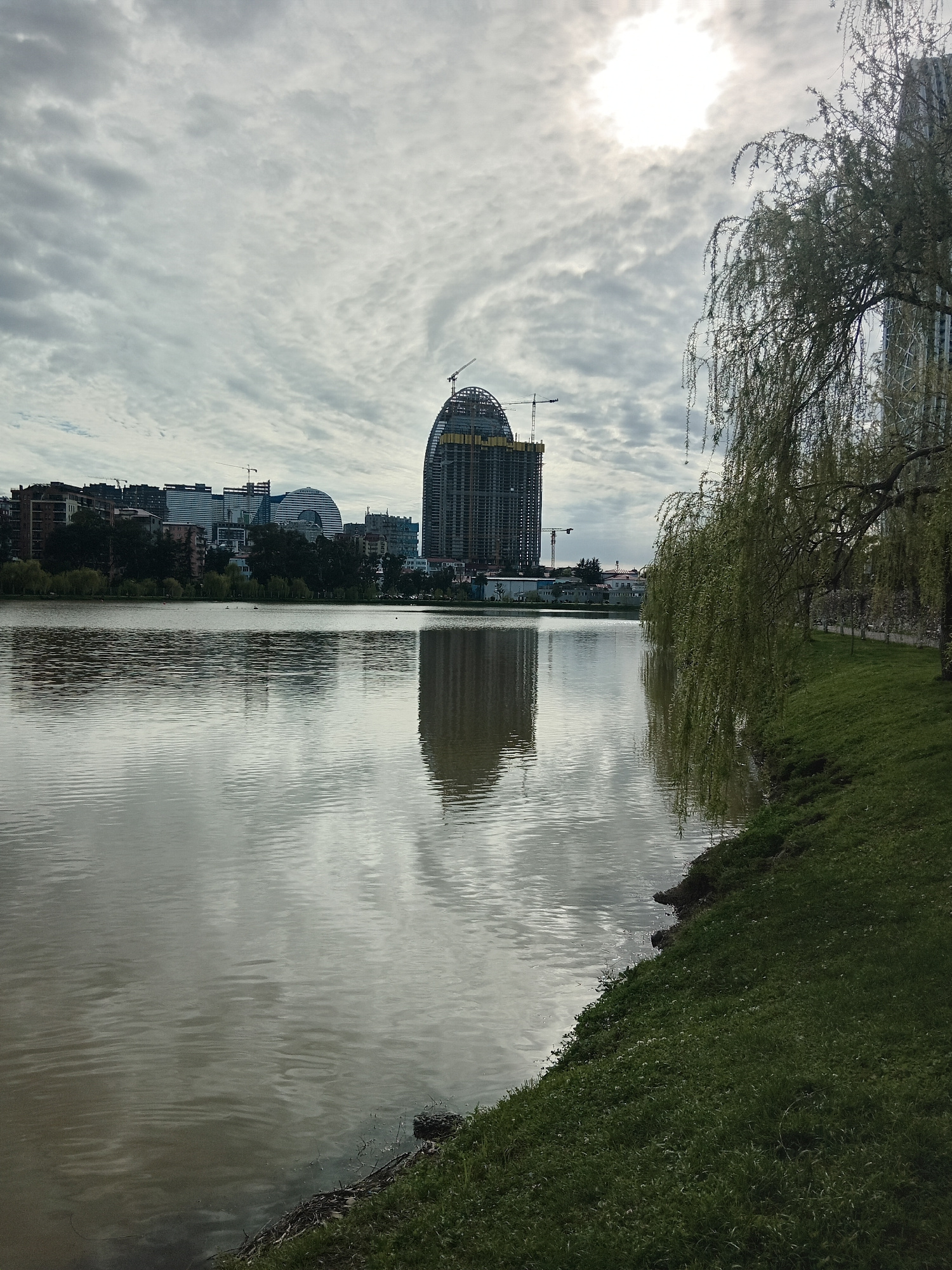 The image shows a body of water reflecting a cityscape under a cloudy sky. A large, unfinished building with a distinctive arched shape and construction cranes is prominent in the background. The city…read more