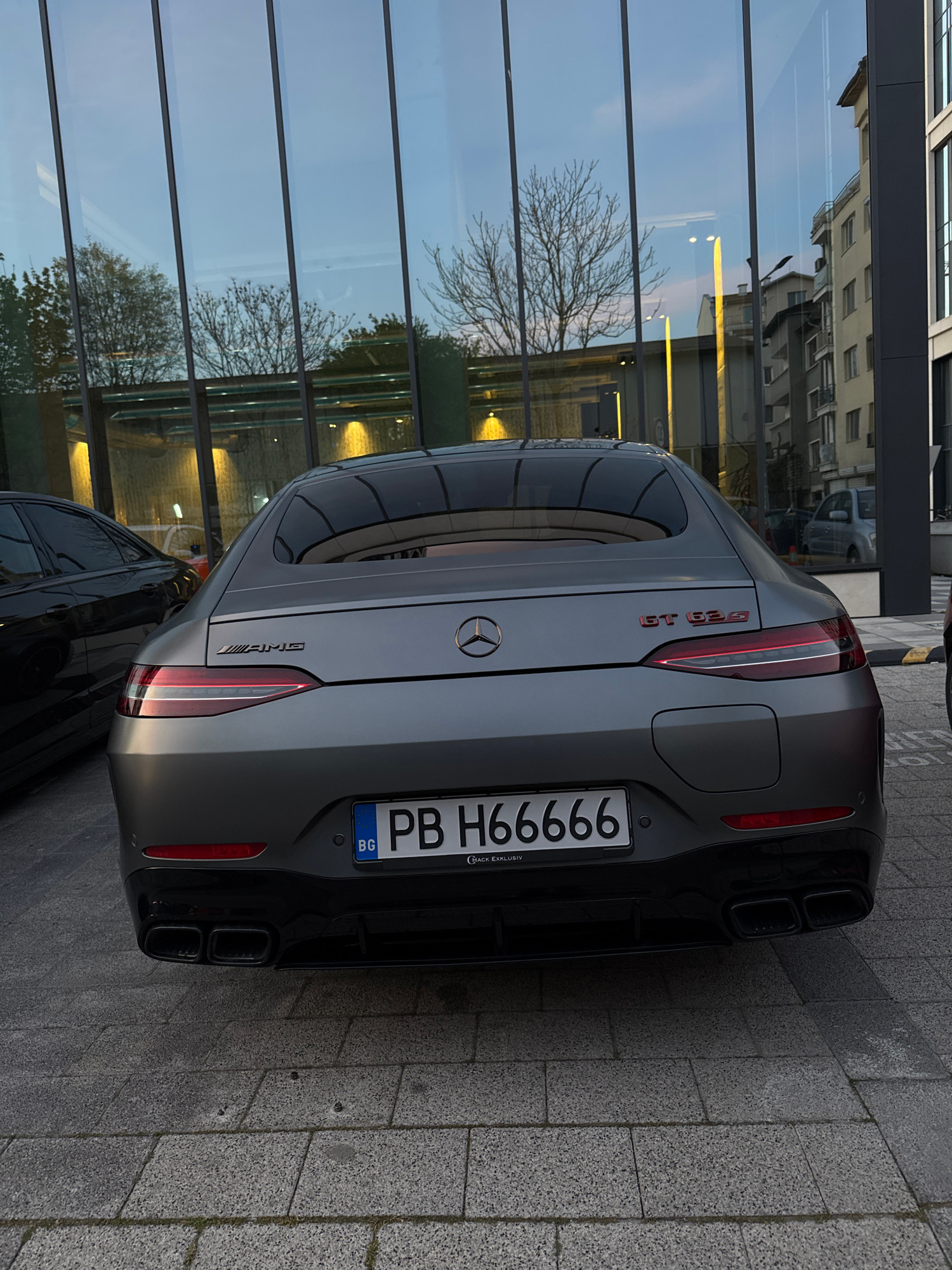 The image depicts the rear of a gray Mercedes-AMG GT 63 S 4-door coupe parked on a paved surface. The car's license plate reads "PB H66666" and includes "BG" indicating Bulgaria. The license plate fra…read more