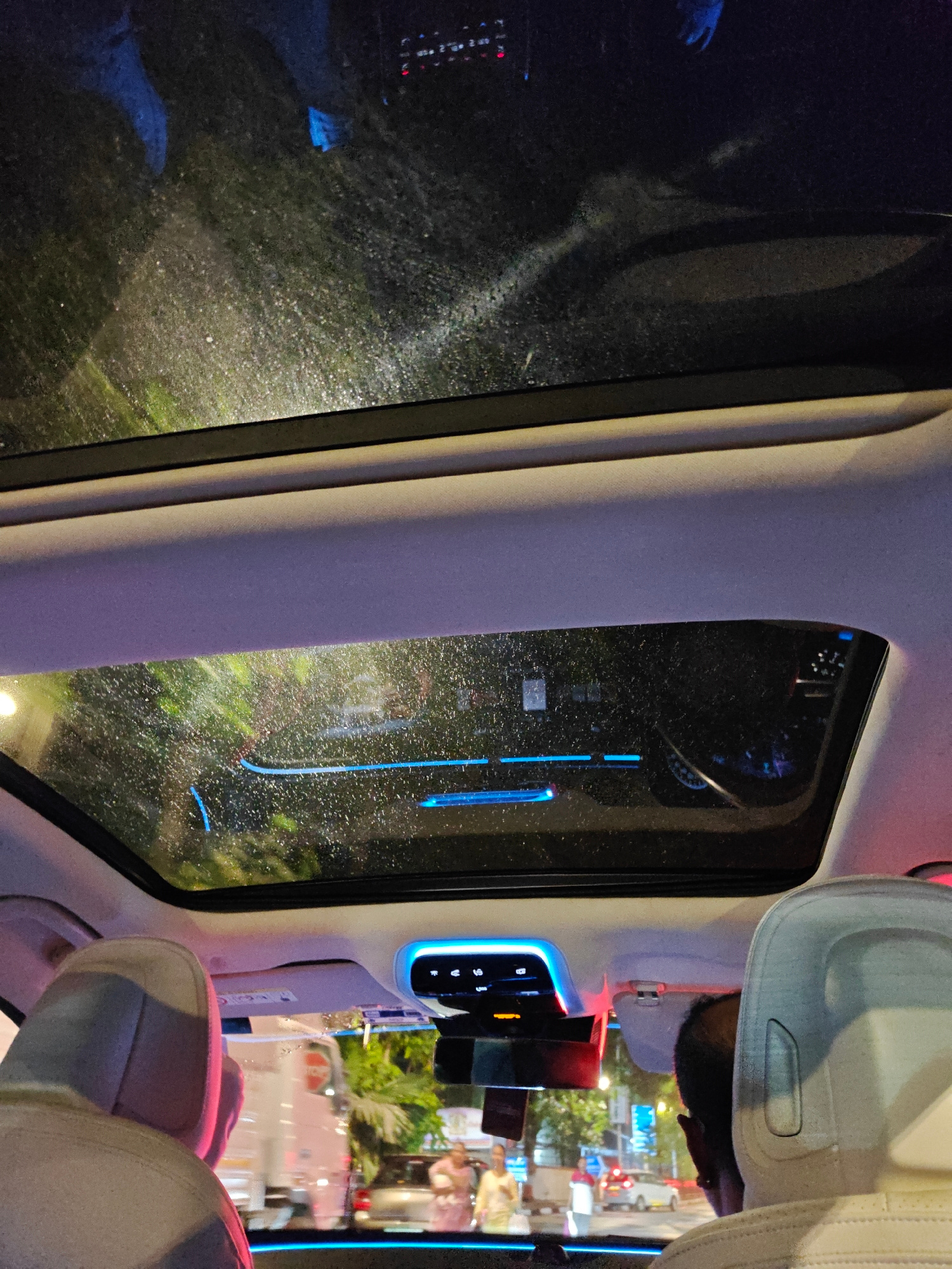 The image provides an interior view from within a vehicle at night, looking forward through the windshield and a panoramic sunroof. Water droplets are visible on the glass surfaces, indicating rain orβ¦read more