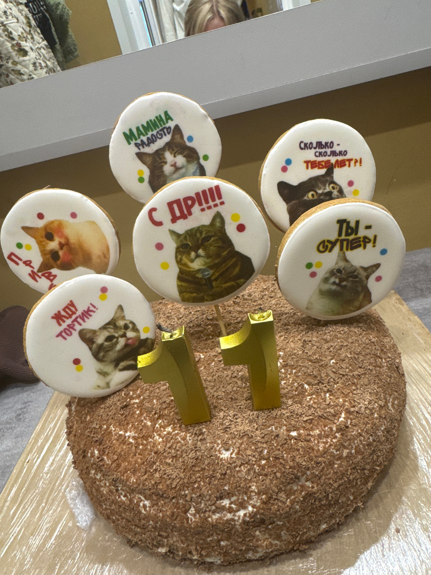 An overhead photograph captures a birthday cake and a collection of decorated cookies arranged on a table in what appears to be an indoor setting in Chaikovsky, Russia. The central item is a large, ro…read more