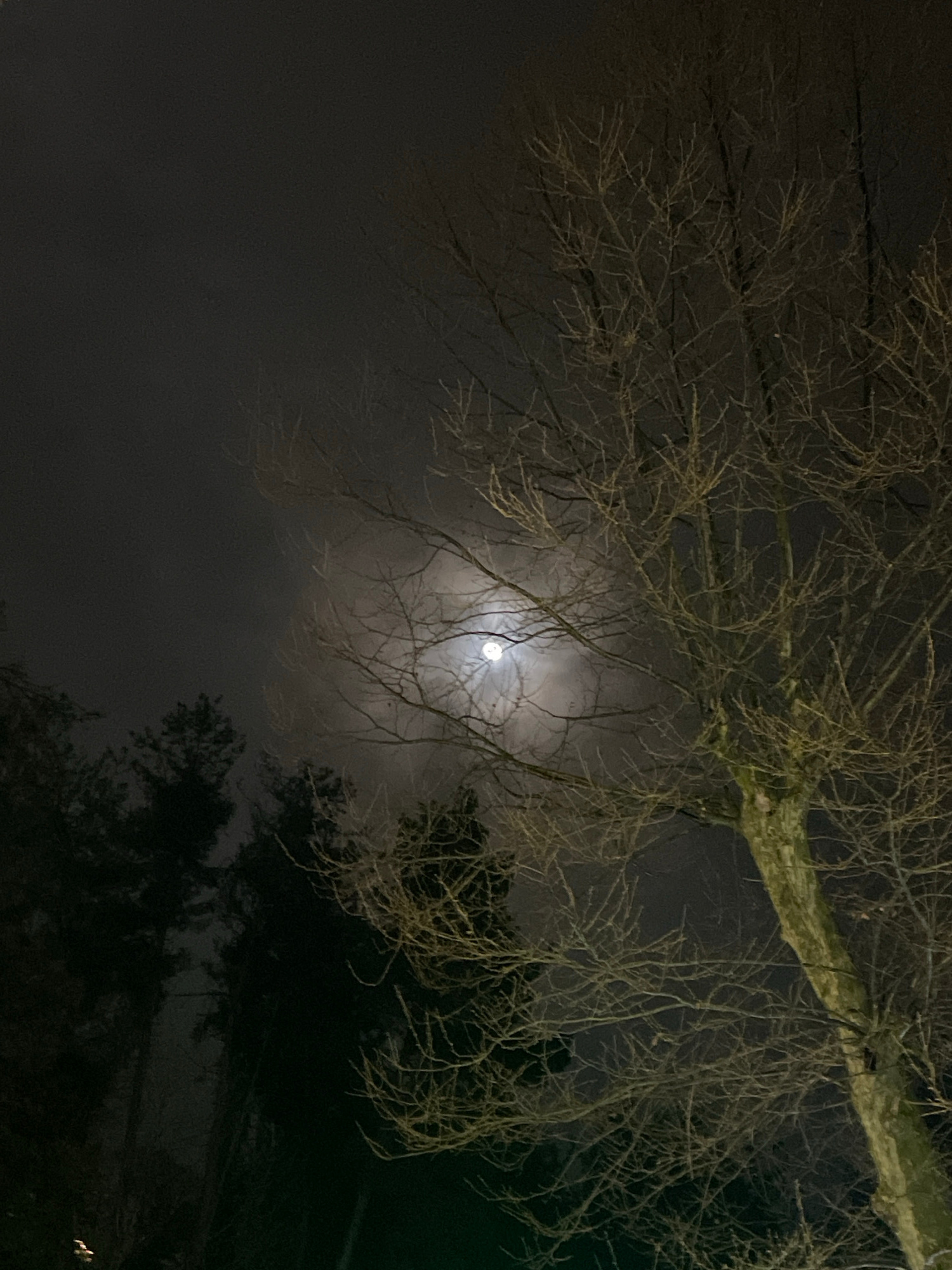 The image depicts a night scene with a full moon shining through clouds, partially obscured by bare tree branches in the foreground. The sky appears dark and overcast. The location is specified as Soc…read more