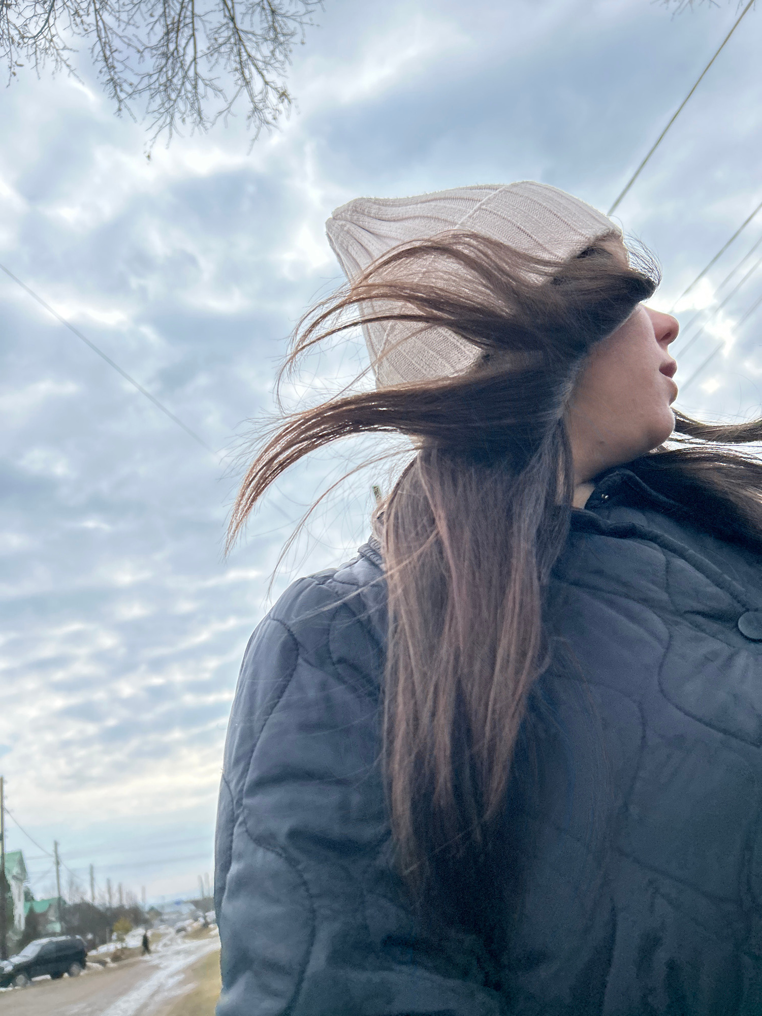 A low-angle photograph shows a person looking upward, with their face tilted towards the sky. They are wearing a light-colored knit hat and a dark, quilted jacket. The person has long, brown hair that…read more