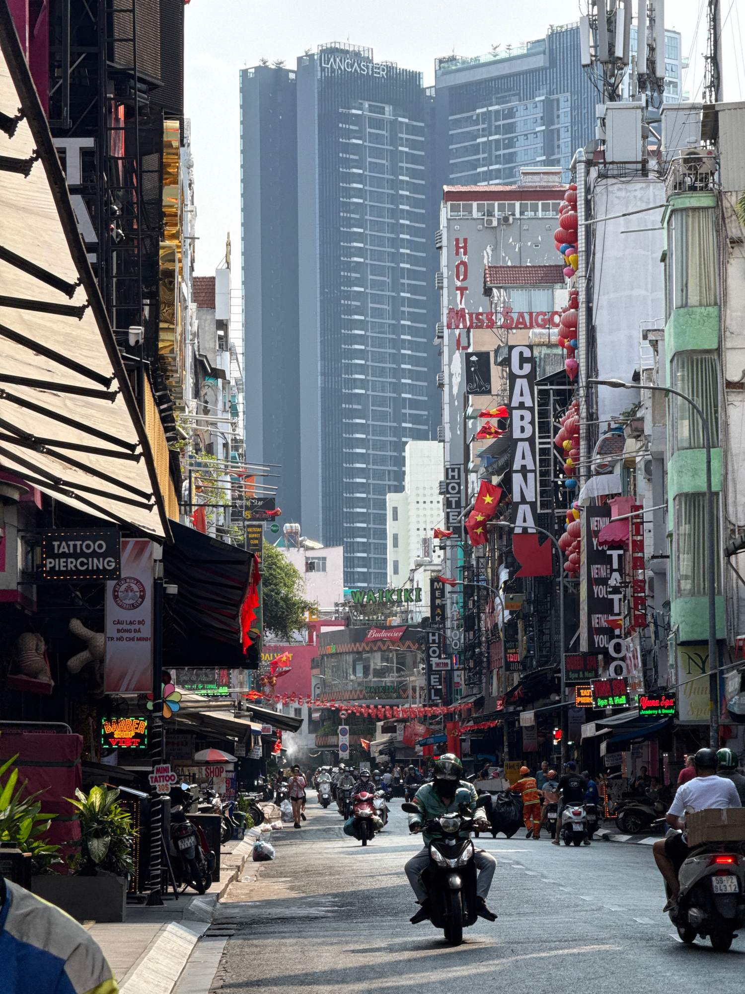 This image portrays a street scene in Thủ Đức, Vietnam. The view is of a street densely packed with motorbikes moving away from the viewer, suggesting heavy traffic. On either side of the road are bui…read more