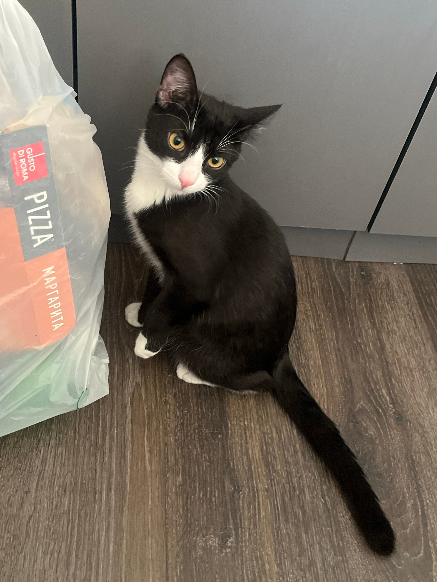 An indoor, overhead shot captures a black and white tuxedo cat looking upwards with bright yellow eyes, a pink nose, and prominent white whiskers. The cat's head is tilted slightly, conveying a curiou…read more