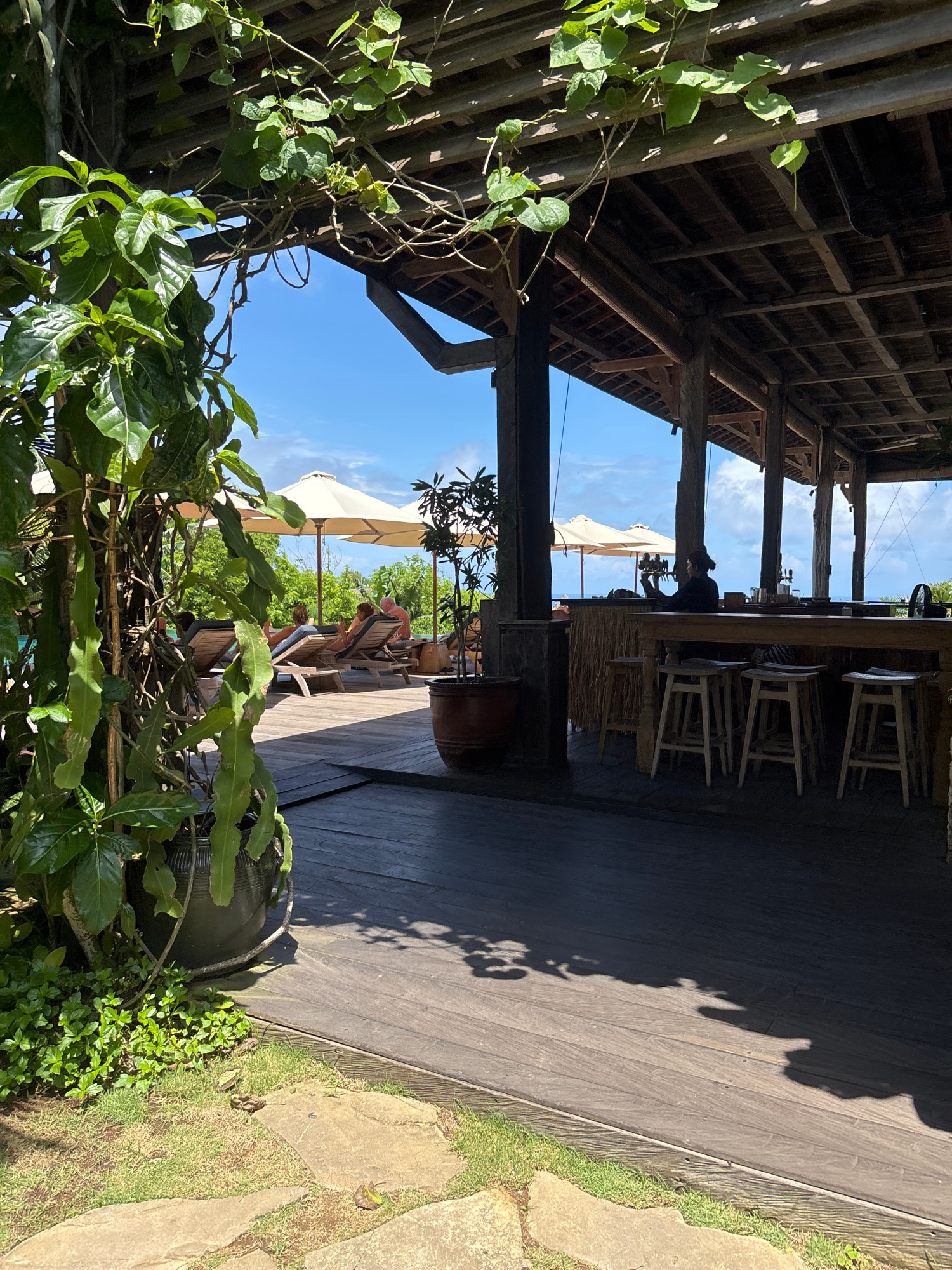 The image captures a partially covered outdoor seating area in Uluwatu, Indonesia. In the foreground, vibrant green foliage obscures the lower left corner of the frame. Moving towards the background,…read more
