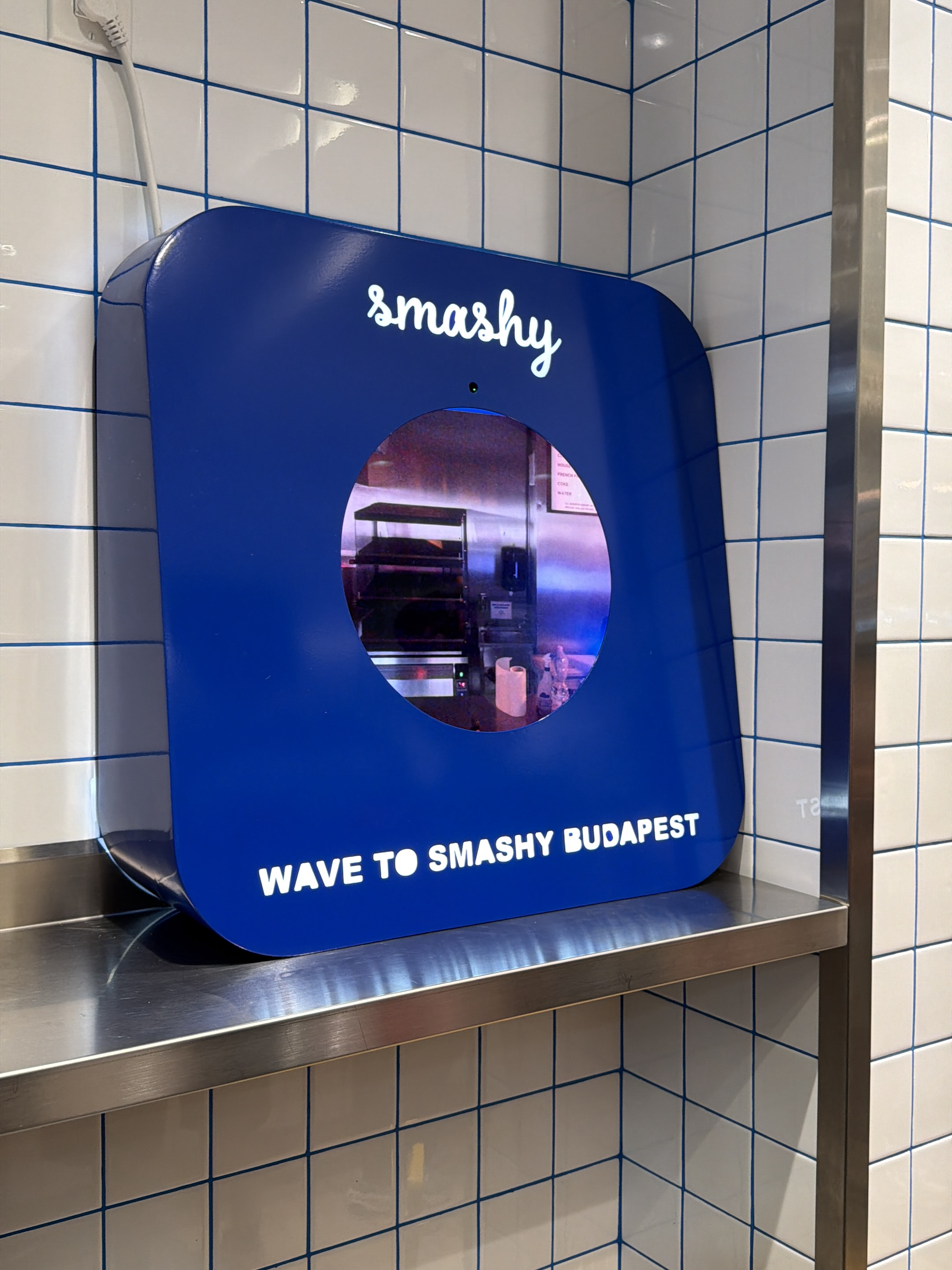 The image shows a blue device with a rounded square shape, labeled "smashy" in a handwritten-style font, and "WAVE TO SMASHY BUDAPEST" in all caps beneath it. It has a circular window through which a…read more