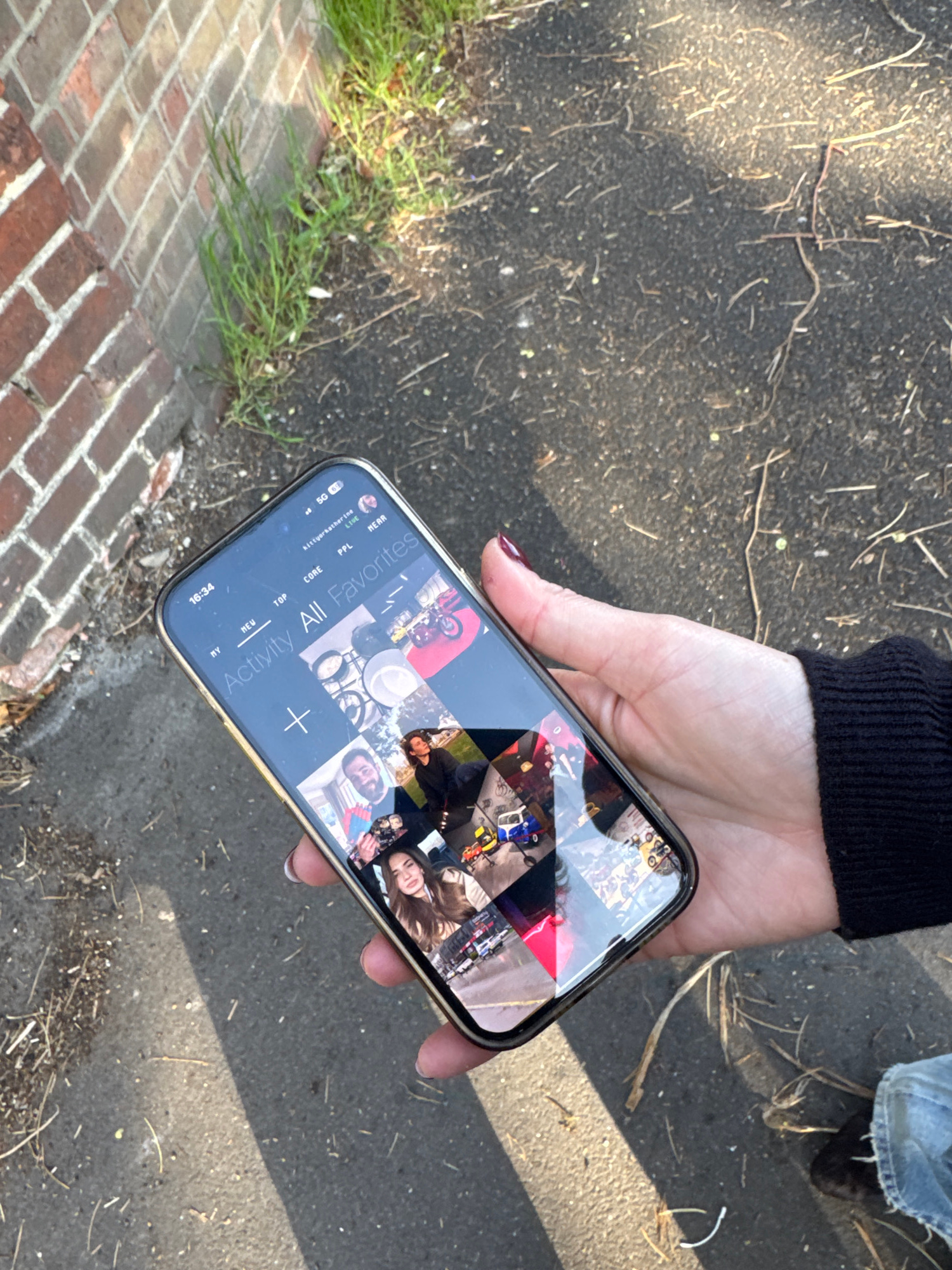 A person holds a smartphone in their right hand, displaying the "Activity All Favorites" screen. The screen shows a grid of images, some of which include human faces. The phone's status bar indicates…read more