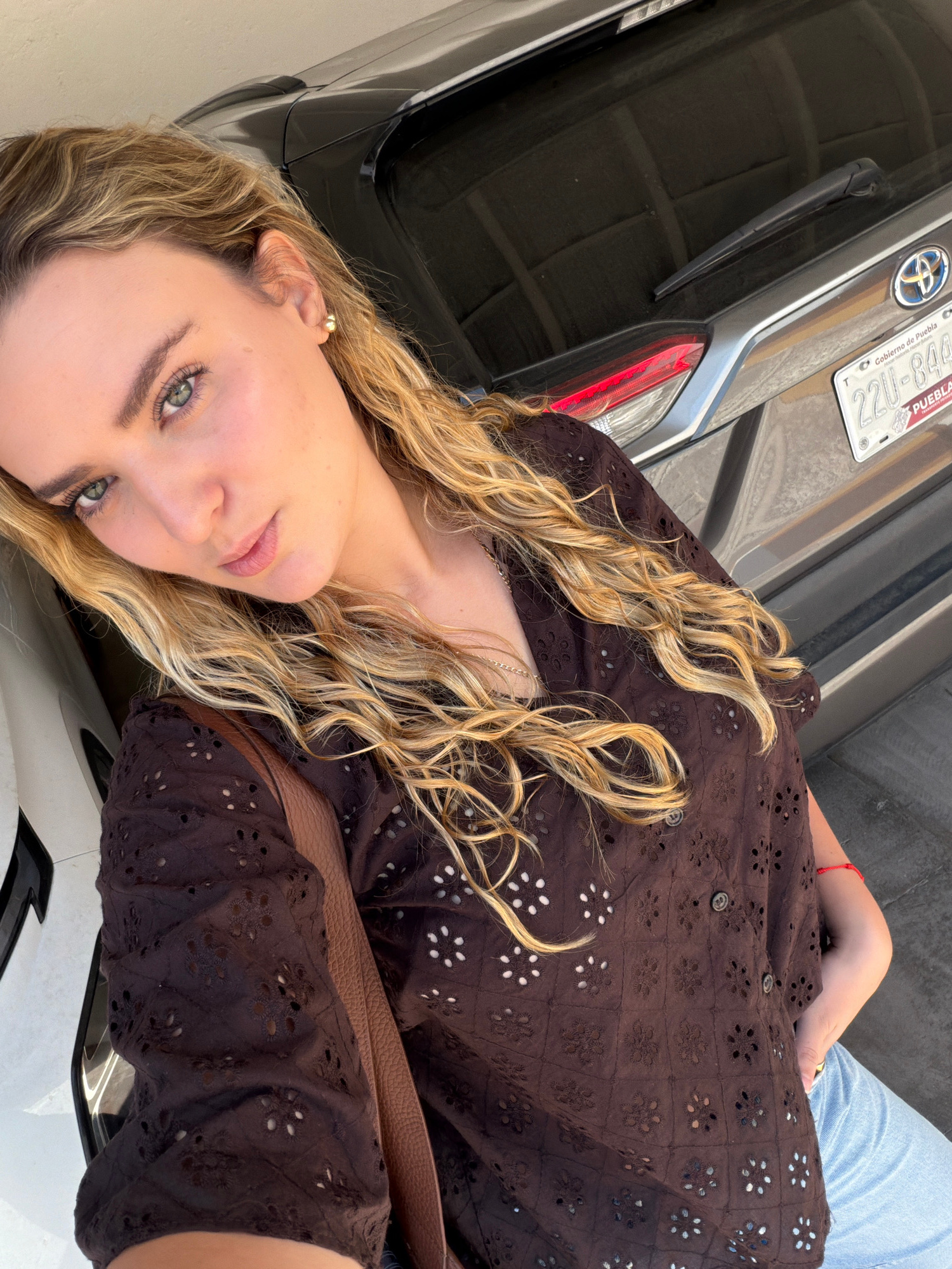 A waist-up shot depicts a fair-skinned woman with light brown hair, wearing a brown, floral-patterned shirt and blue jeans. A brown leather purse strap is visible across her shoulder. She is positione…read more