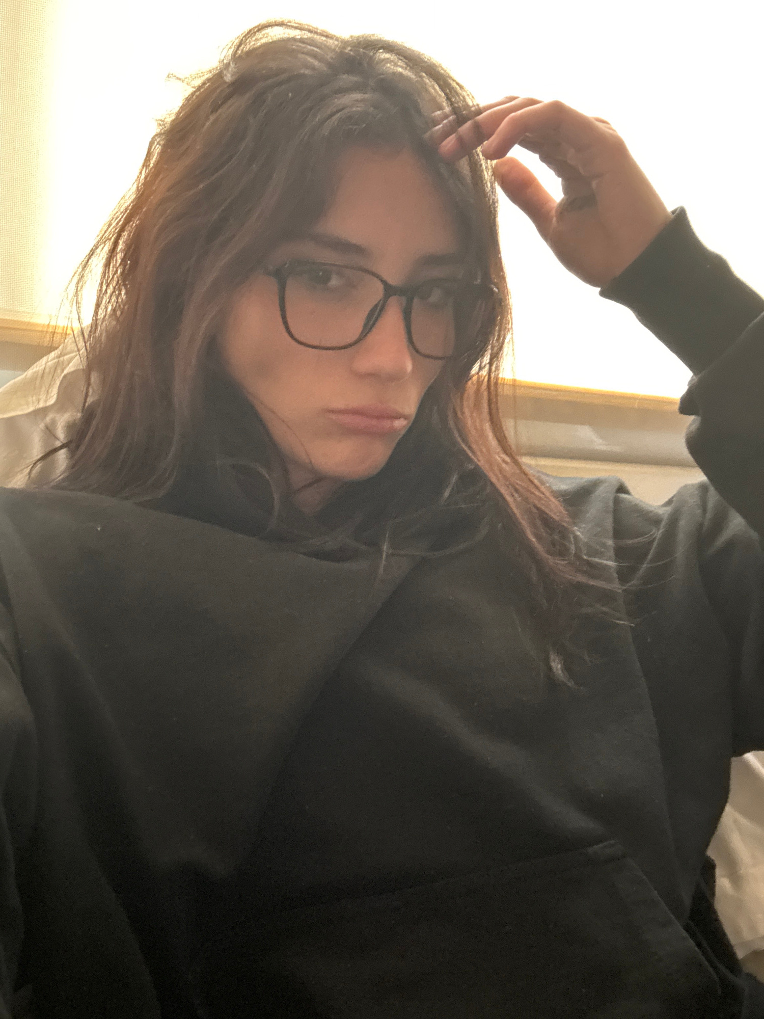 A woman with brown hair and glasses is lying down, possibly on a bed, wearing a black hoodie. Her hand is touching her hair. The location cannot be determined from the image, nor can the city of Bueno…read more