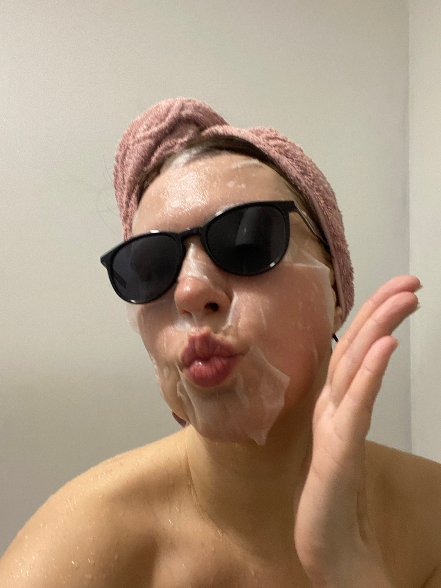 A woman is shown from a low angle, wearing a face mask and dark sunglasses, with a peach-colored towel wrapped around her head. Her skin appears wet, possibly from a recent shower. She is holding up o…read more