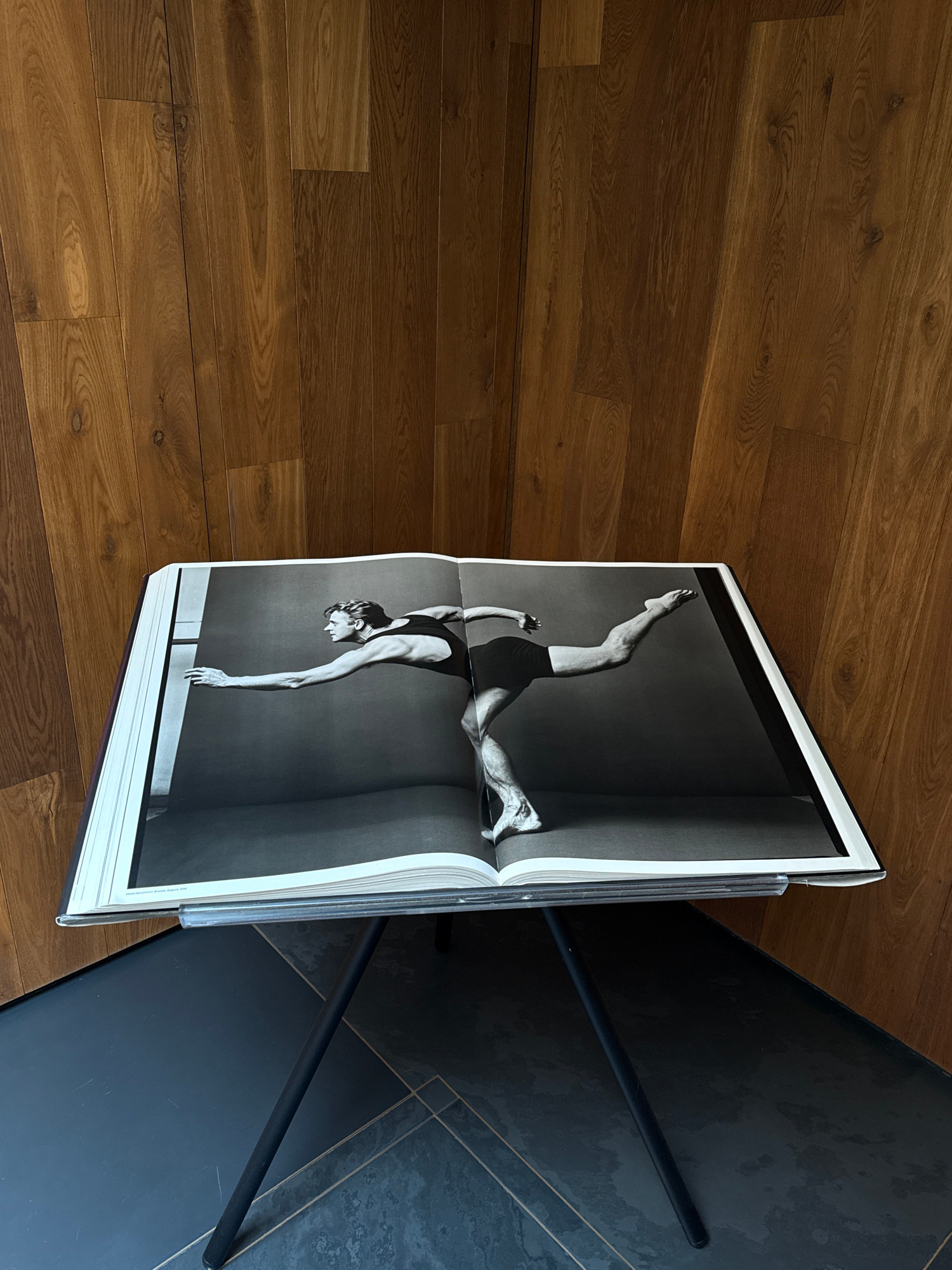 An open, large format book rests on a minimalist black stand with thin, angled metal legs. The book is splayed open to a two-page spread featuring a black and white photograph of a muscular male dance…read more