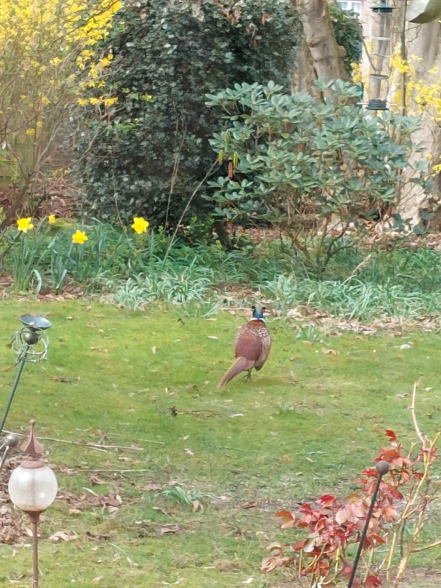 The image shows a garden scene in Ganderkesee, Germany. A pheasant stands on a grassy lawn adjacent to a flower bed with daffodils and other plants. A bush with green leaves and yellow flowers is to t…read more