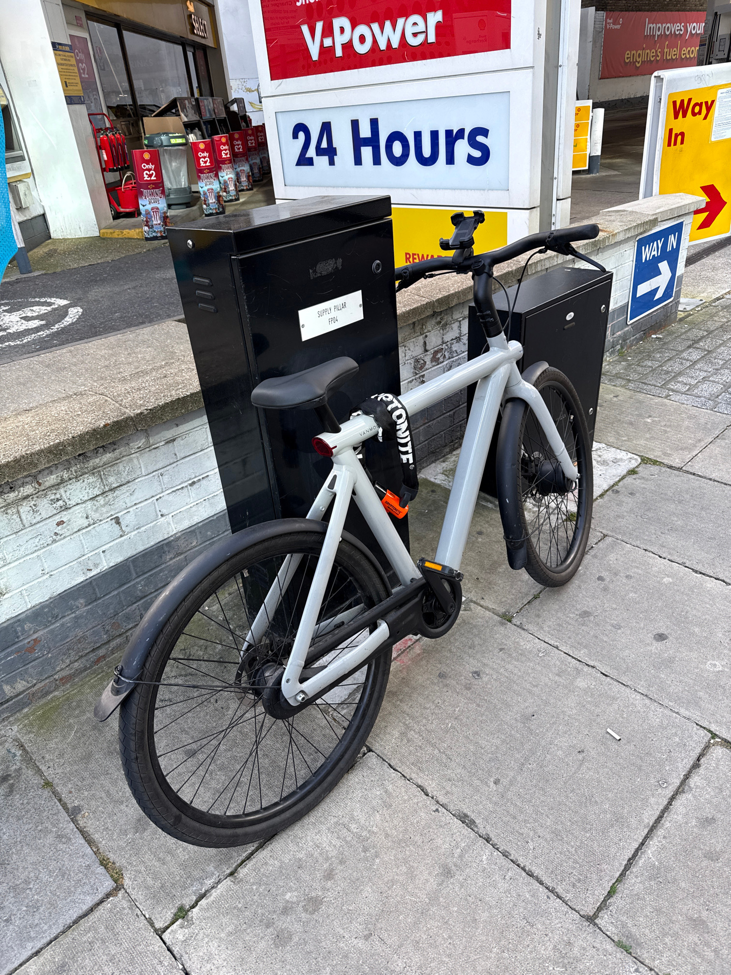 A light grey VanMoof bicycle is locked to a black supply pillar on a sidewalk in London, United Kingdom. The pillar is adjacent to a Shell gas station, with visible signage indicating "V-Power 24 Hour…read more