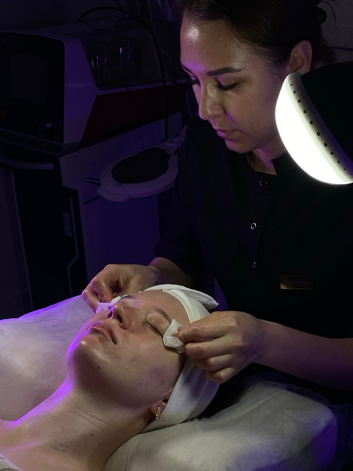 A medium shot depicts a woman lying on a white, possibly paper-covered surface, receiving a facial treatment. She has a white towel wrapped around her head and is wearing gold earrings. Her skin appea…read more