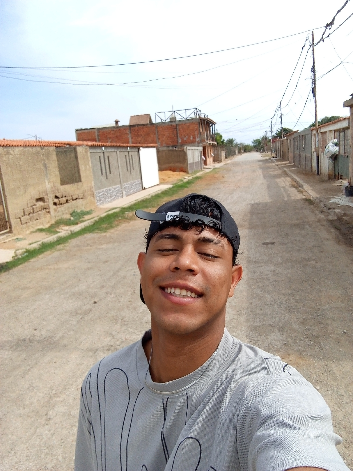 A young man is featured in a selfie taken on an unpaved street, smiling broadly with his eyes closed. He has light skin, dark curly hair, and is wearing a black baseball cap backward, along with a lig…read more