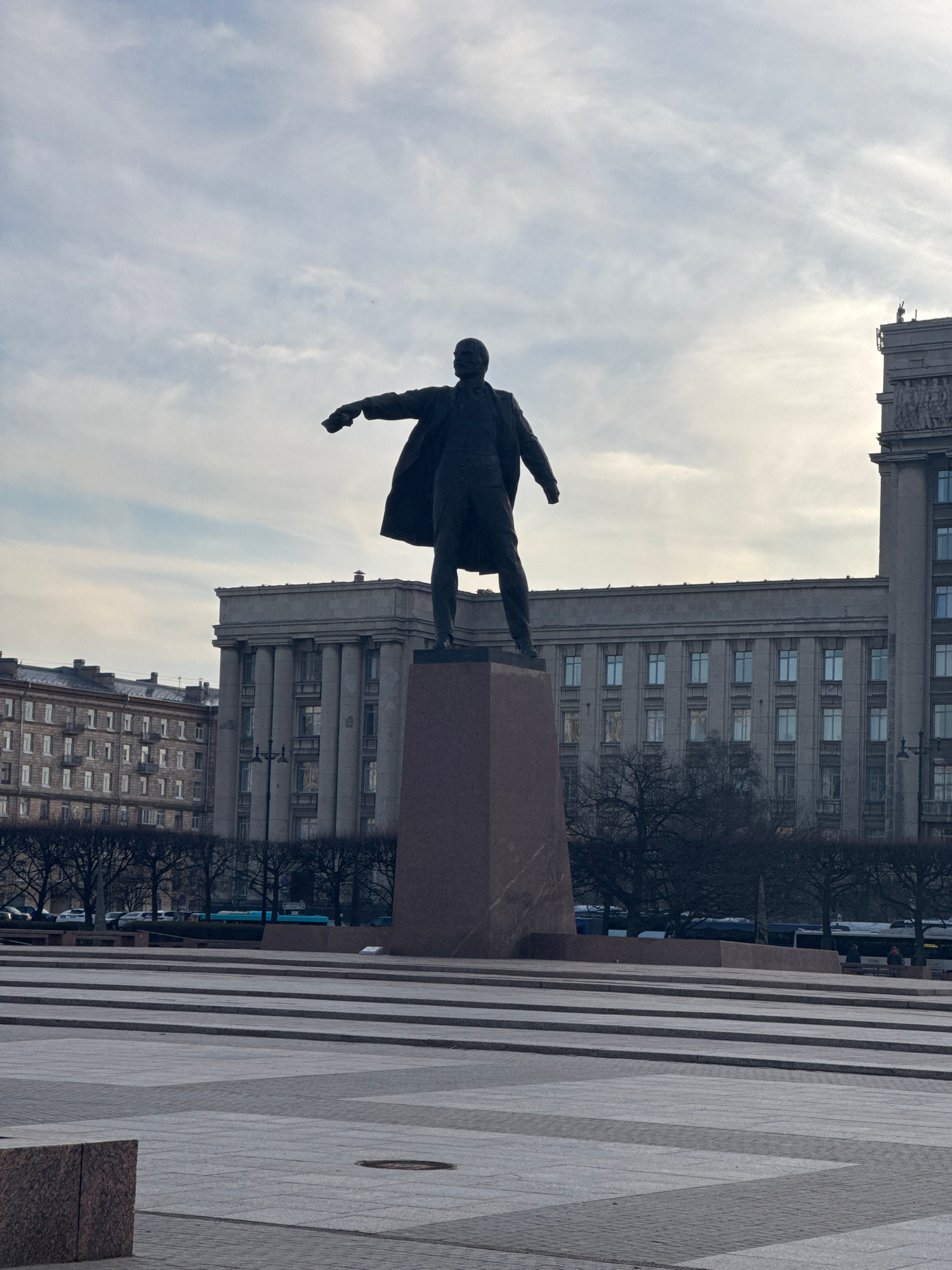 A statue of Vladimir Lenin stands atop a dark-red granite pedestal in front of a large, neoclassical building, likely a government or public building, in Saint Petersburg, Russia. The statue is made o…read more