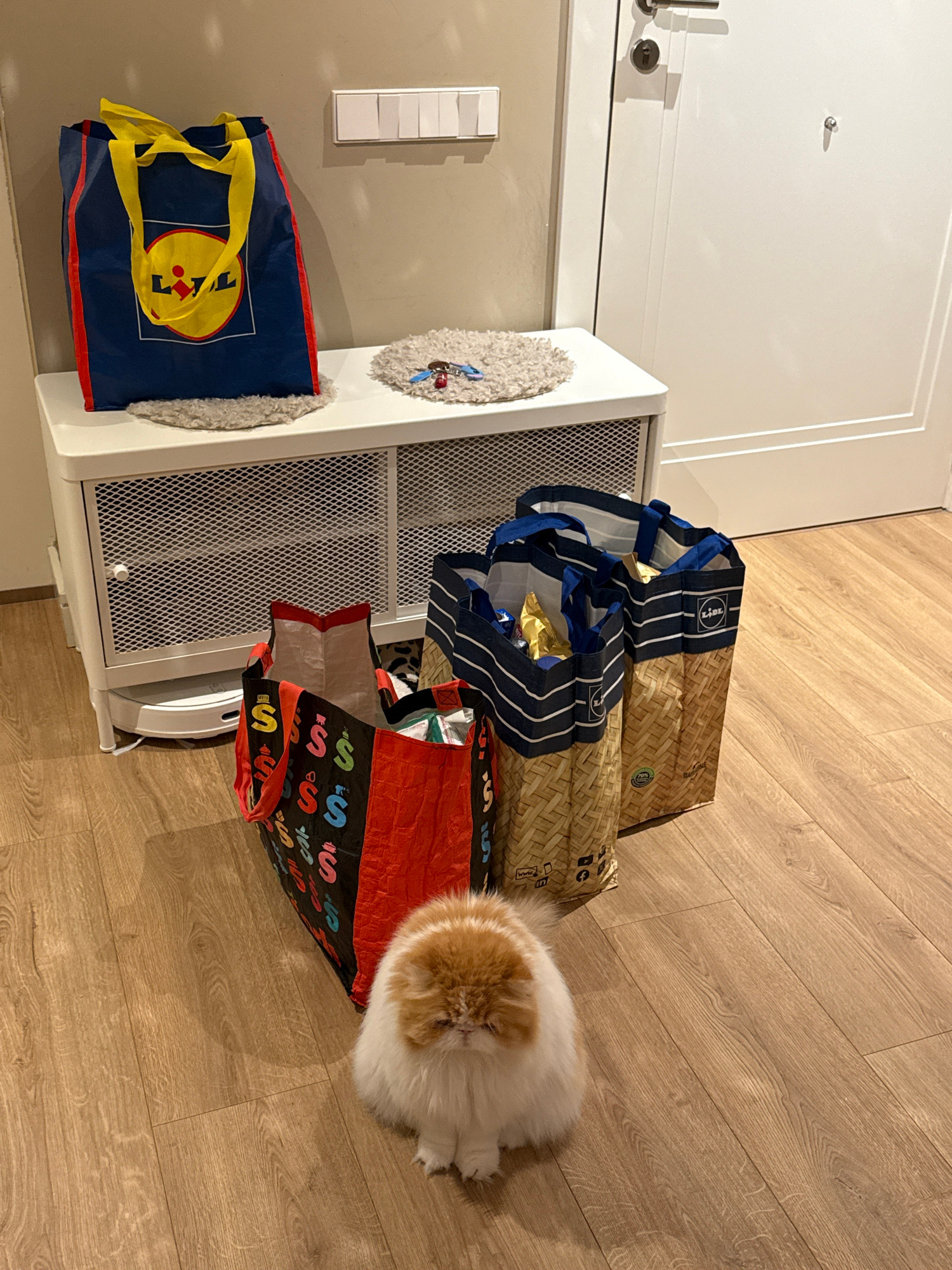 The image shows an indoor scene with a white cabinet positioned against a white door and light-colored wall. The cabinet is topped with a gray, fluffy rug and holds multiple shopping bags of varying dā¦read more