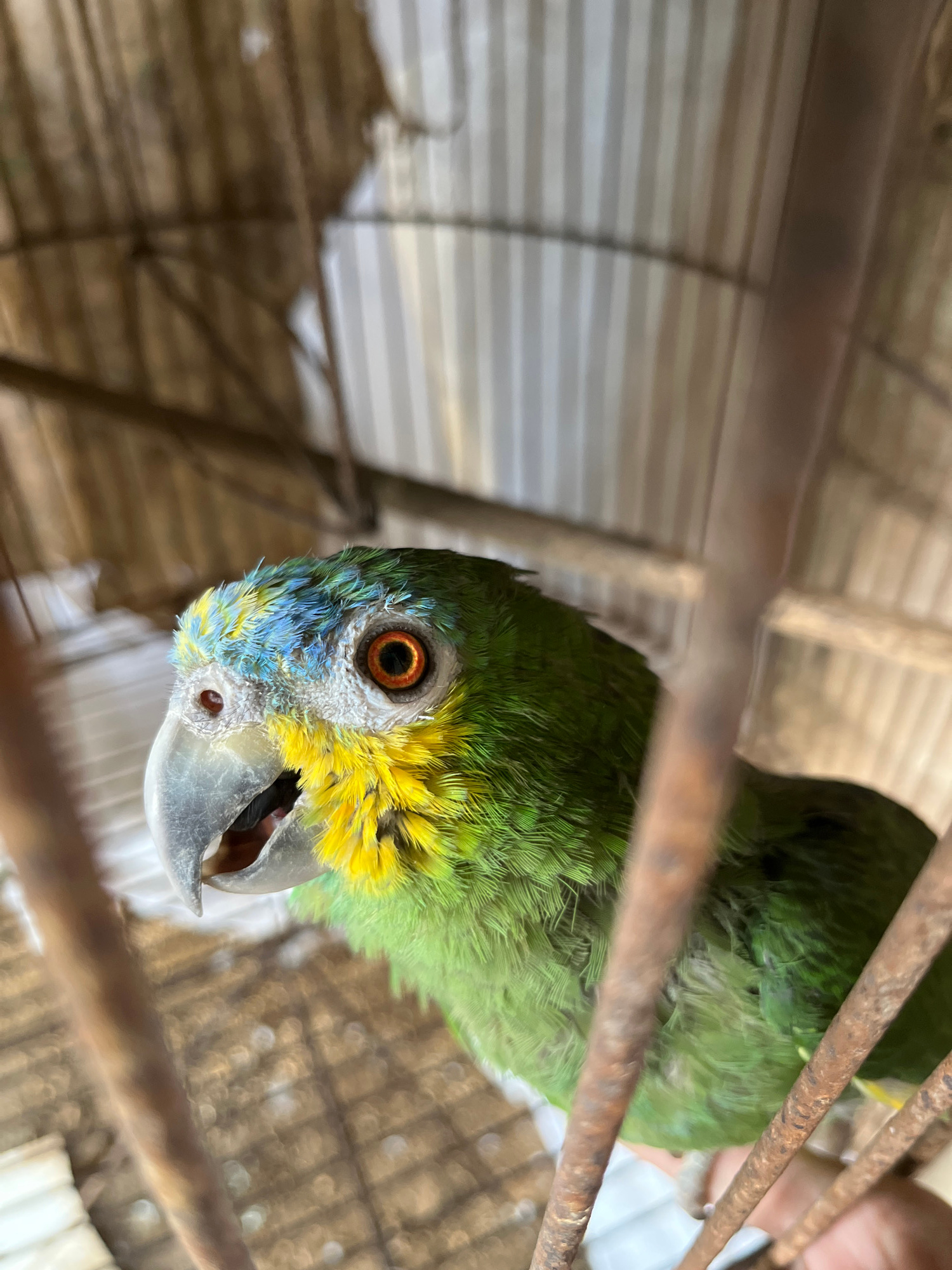 A close-up shot depicts a green parrot with yellow and blue markings, seemingly in a cage with rusted metal bars. The parrot's eye is visible, and it appears to be looking directly at the camera. The…read more