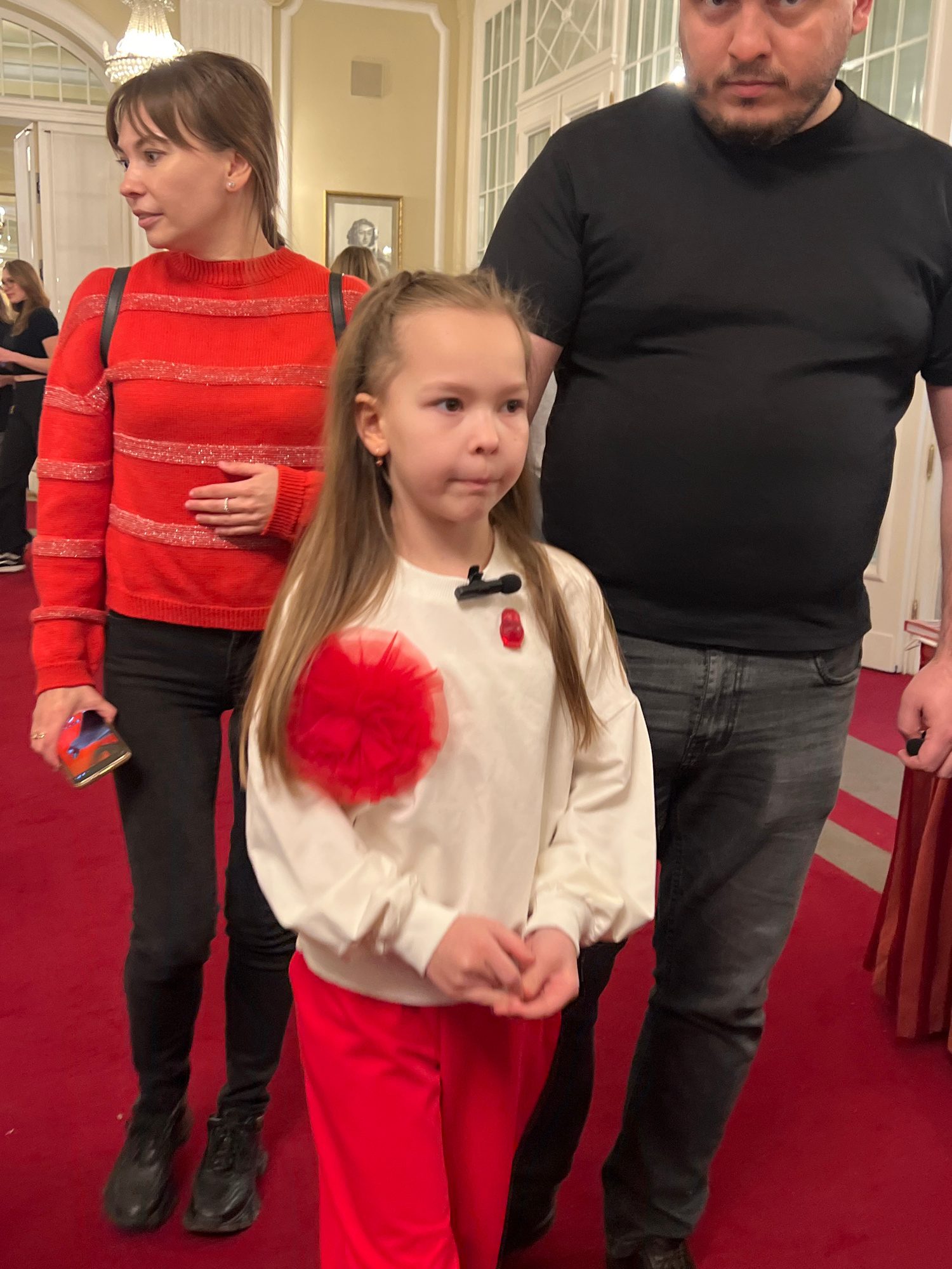 Three individuals are in the frame, in what appears to be an ornate indoor setting. A man in a black shirt and gray pants is positioned near the top of the frame. A woman is present and wearing a red-…read more